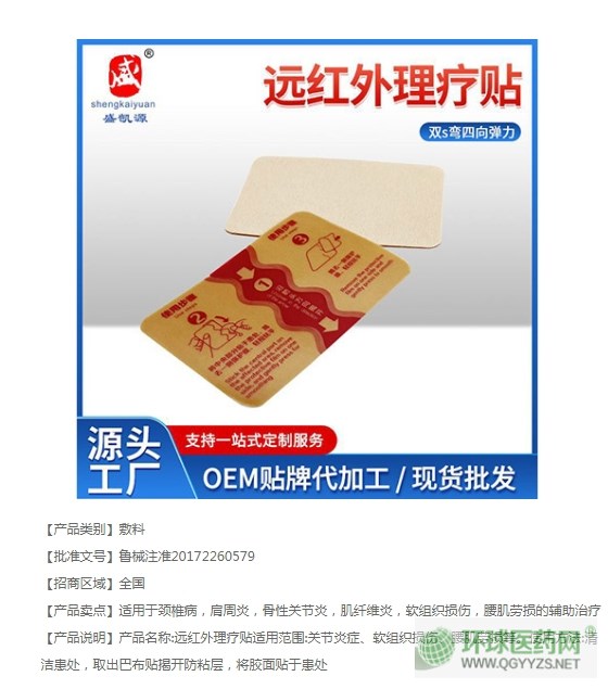 | 產(chǎn)品賣點(diǎn) | 二類醫(yī)療器械,藥店可刷醫(yī)保。緩解疼痛,舒筋活血,促進(jìn)血液循環(huán),效果明顯。 |