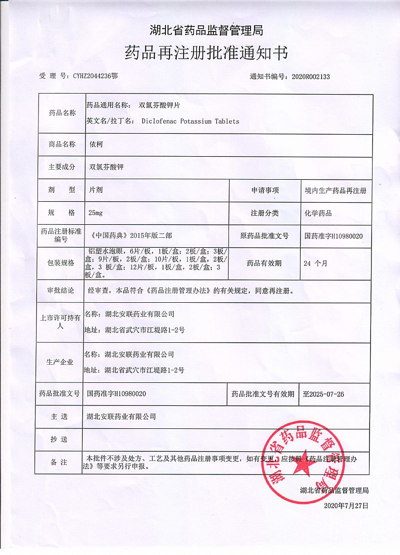 | 補(bǔ)充說明 | 【性狀】本品為薄膜衣片,除去薄膜衣后顯白色或類白色。 【禁忌】1.胃腸道潰瘍患者禁用。2.對其他非甾體抗炎藥過敏者禁用。3.對使用阿司匹林或其他非甾體抗炎藥物如布洛芬而誘發(fā)哮喘、蕁麻疹或急性鼻炎史的患者禁用。4.孕婦及哺乳期婦女禁用。 【注意事項(xiàng)】 1.本品為對癥治療藥,不宜長期使用,用于止痛不得超過5天,如癥狀不緩解,請咨詢醫(yī)師或藥師。2.請嚴(yán)格按用法用量服用,如服用過量或有嚴(yán)重不良反應(yīng)時(shí)請立即就醫(yī)。3.60歲以上患者應(yīng)根據(jù)體質(zhì)情況謹(jǐn)慎使用。尤其對體弱和體重過輕的老年患者建議使用*低有效劑量。4.如果出現(xiàn)以下情況,需在醫(yī)生的指導(dǎo)下服用本品:-曾經(jīng)在服用疼痛抑制劑或抗炎類藥物后出現(xiàn)胃腸道病變或胃疼或心口灼痛。-哮喘或過敏體質(zhì)。—有胃腸道潰瘍病史者。-患有心臟病或高血壓。-患有肝臟或腎臟疾玻-患有出血性疾患或血液。ㄖ饕獮槟獧C(jī)制或血小板功能障礙,如血友。蛘咂渌盒约膊,包括非常少見的肝卟啉癥。-同時(shí)合并其他疾玻5.如果出現(xiàn)眩暈或其他中樞神經(jīng)系統(tǒng)功能紊亂,包括視覺功能紊亂,應(yīng)禁止駕駛或操作機(jī)器。6.對本品過敏者禁用,過敏體質(zhì)者慎用。7.本品性狀發(fā)生改變時(shí)禁止使用。8.請將本品放在兒童不能接觸的地方。9.如正在使用其他藥品,使用本品前請咨詢醫(yī)師或藥師。 【不良反應(yīng)】如果出現(xiàn)一種或一種以上的下列情況時(shí),請停止服用本品,并立即咨詢醫(yī)師:1.腹瀉,胃腸氣脹,胃疼,心口灼熱或上腹部疼痛。2.異常疲倦或總體感覺不好。3.眩暈,食欲減退伴持續(xù)惡心和/或嘔吐。4.嘔血,黑便或尿血。5.皮膚改變,如:紅斑或瘙癢癥狀等,以及罕見的皮疹。6.呼吸困難或呼吸短促。7.皮膚或鞏膜黃染。8.持續(xù)的咽喉痛或發(fā)熱。9.面部、雙足或腿部腫脹。10.重癥頭痛。11.胸痛或咳嗽。如果出現(xiàn)其他不良反應(yīng)也應(yīng)立即咨詢醫(yī)師。 【藥理毒理】本品屬非甾體類抗炎藥,主要通過抑制前列腺素的合成而產(chǎn)生鎮(zhèn)痛、抗炎、解熱作用。 【執(zhí)行標(biāo)準(zhǔn)】本品主要成份是雙氯芬酸鉀 |