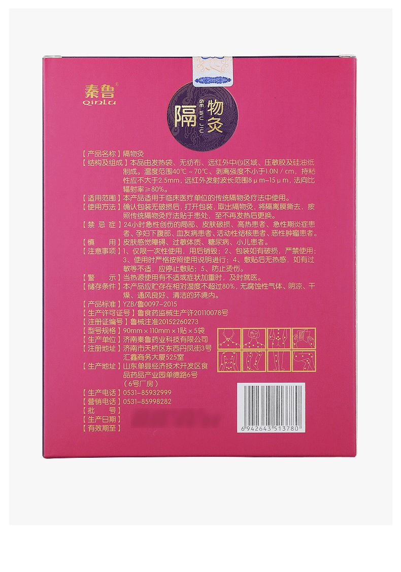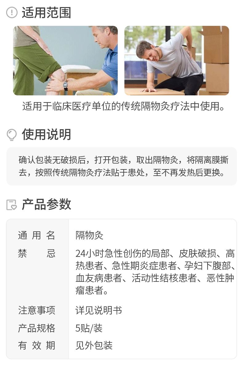 | 補充說明 | [慎用]皮膚感覺障礙、過敏體質、糖尿病、小兒患者應慎用。 [禁忌癥] 24小時急性創(chuàng)傷的局部、皮膚破損、高熱患者、急性期炎癥患者、孕婦下腹部、血友病患者、活動性結核患者、惡性腫瘤患者應禁用。 [使用說明]確認包裝無破損后,打開包裝,取出隔物灸,將隔離膜撕去,按照傳統(tǒng)隔物灸療法貼于患處,至不再發(fā)熱后更換。 [注意事項、警示及提示性說明] 1、僅限一次性使用, 用后銷毀。 2、包裝如有破損,嚴禁使用。 3、使用時嚴格按照使用說明進行。 4、敷貼后無熱感,如有不適,應停止敷貼。 5、防止燙傷,當熱源使用有不適或癥狀加重時,及時就醫(yī)。 [儲存條件、方法]本產(chǎn)品應貯存在相對濕度不超過80%,無腐蝕性氣體、干燥、通風良好、清潔的環(huán)境內。 |