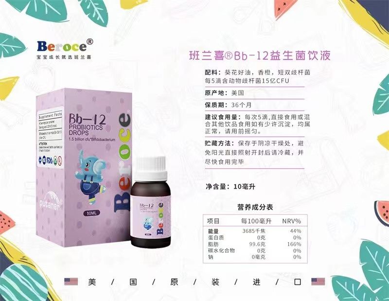 | 補(bǔ)充說(shuō)明 | Bb-12益生菌飲液 配料:葵花籽油,香橙,動(dòng)物雙岐桿菌 每5滴含動(dòng)物雙岐桿菌15億CFU 建議食用量:每次5滴,直接食用或混合其他飲品食用 如有少許沉淀,均屬正常,請(qǐng)用前搖勻。 貯藏方法:保存于陰涼干燥處,避免陽(yáng)光直接照射 開(kāi)封后請(qǐng)冷藏,并盡快食用完畢 保質(zhì)期:36個(gè)月 原產(chǎn)國(guó):美國(guó) BB-12™ 動(dòng)物雙歧桿菌乳亞種菌株自1985年起即作為食品原料和膳食補(bǔ)充劑在全球范圍內(nèi)使用,是擁有大量公開(kāi)科學(xué)研究及臨床數(shù)據(jù)支持的益生菌菌株。 |