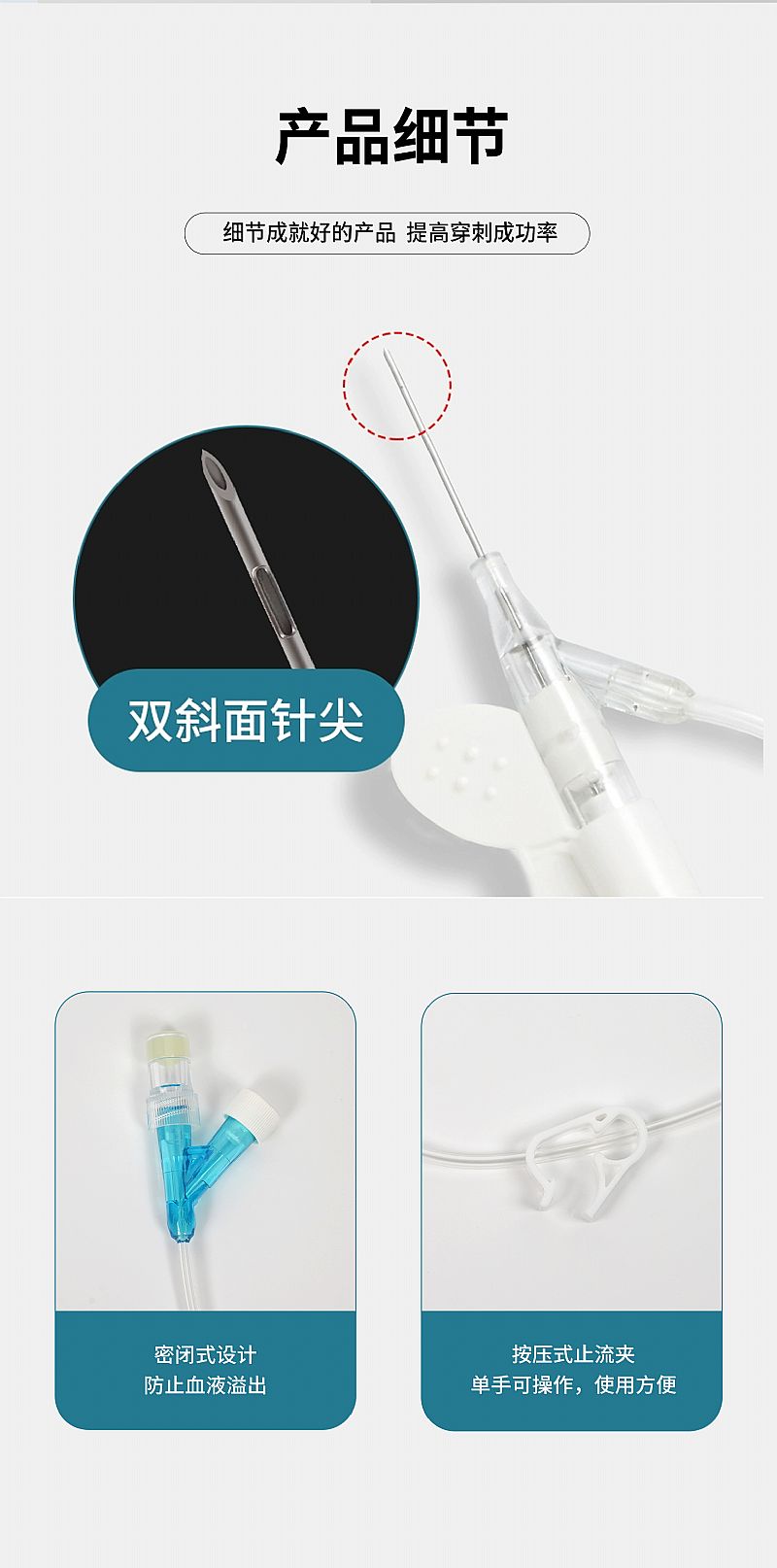 | 使用方法 | 1.使用前檢查產(chǎn)品的單包裝是否完整,產(chǎn)品的保護套是否脫落等。2.將一次性使用靜脈留置針從單包裝中取出,檢查肝素帽連接是否緊密(圖一);取下保護套,檢查套管有無斷裂、開叉及起毛邊等現(xiàn)象(圖二)。3.將輸液器直接與留置針三通相接,松開調(diào)節(jié)器,排出留置針內(nèi)長導(dǎo)管組件內(nèi)的空氣,夾閉留置針長導(dǎo)管,將取下的頭皮針針尖斜面插入肝素帽內(nèi),排盡肝素帽內(nèi)的空氣。4.選擇適合穿刺的部位,按常規(guī)方法消毒后(如碘伏消毒棉球擦拭),在穿刺 點上方10cm處扎止血帶,轉(zhuǎn)動針芯,使針頭斜面向上以15°-30°角刺入,見回血后降低角度再進針0.2-0.5cm(圖三),退出針芯約0.2-0.3cm,將套管全部送入血管(圖四),將針芯全部拔出,松開止血帶,用無菌透明敷料將留置針固定在皮膚上。注意:切勿將針管重新插入導(dǎo)管,否則可能導(dǎo)致導(dǎo)管損傷或斷裂。5.輸液結(jié)束后將3ml封管用抗凝劑(3125u肝素鈉+生理鹽水100ml混勻)正壓封管,關(guān)閉留置針軟管上的止流夾。6.下次再輸液時,打開留置針軟管上的止流夾,用頭皮針或注射針直接插入肝素帽內(nèi)輸入藥液或血液。7.使用結(jié)束后,按常規(guī)方法直接將留置針拔離靜脈。 |