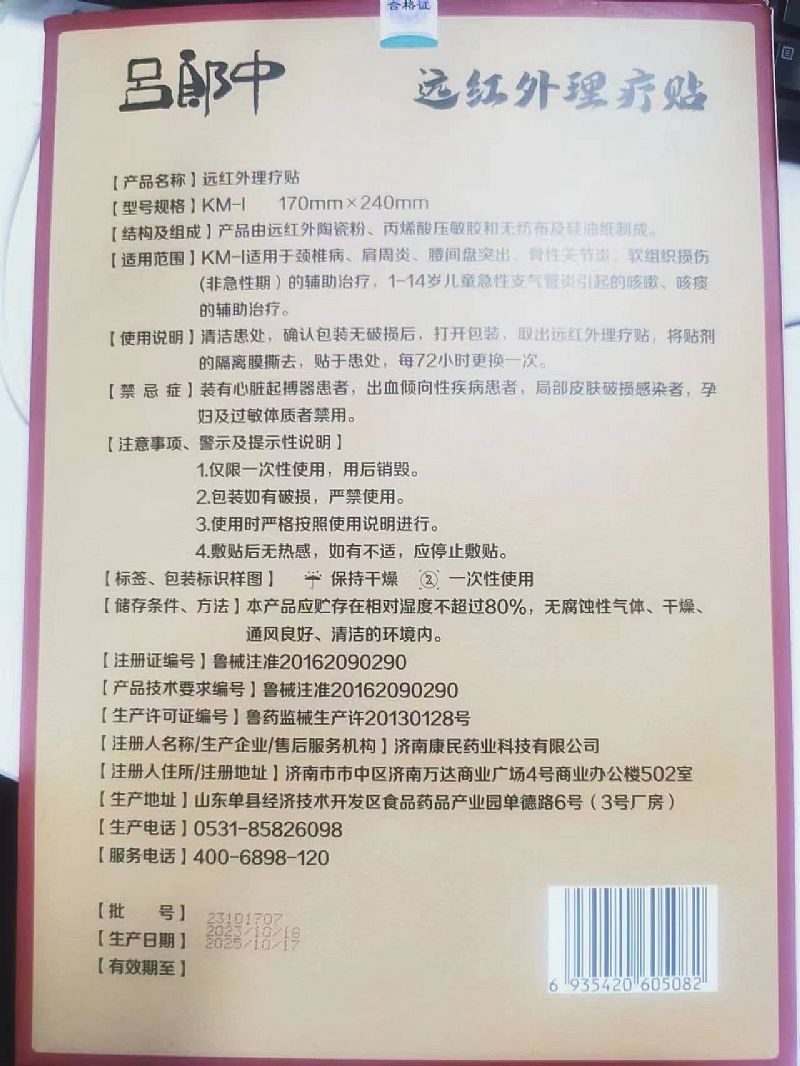 | 使用方法 | 清潔患處,確認(rèn)包裝無破損后,打開包裝,取出遠(yuǎn)紅外理療貼,將貼劑的隔離膜撕去,貼于患處,貼敷時間24小時。 |