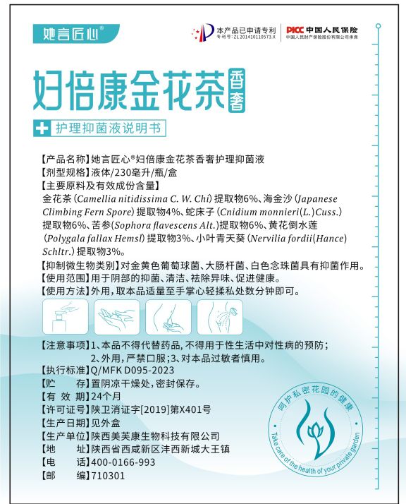 產(chǎn)品名稱(chēng): 她言匠心®;;婦倍康金花茶香奢護(hù)理抑菌液(專(zhuān)利