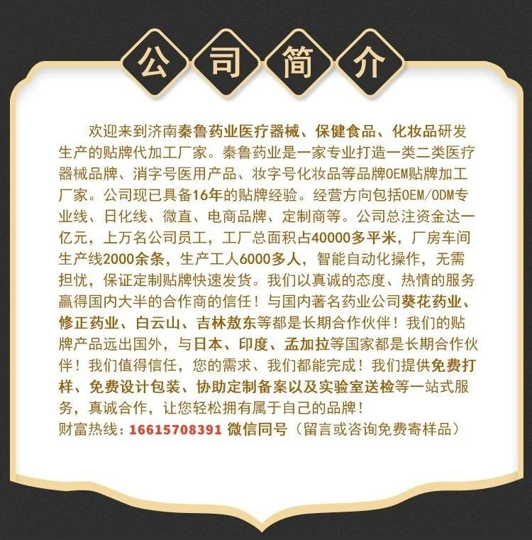 | 其它說明 | 1、優(yōu)質(zhì)服務(wù):專業(yè)OEM服務(wù)團隊一對一服務(wù),從設(shè)計到出貨全程專人跟進。 2、出貨迅速:包裝定稿,專業(yè)生產(chǎn)團隊可在10—15天內(nèi)交付發(fā)貨。 3、質(zhì)量:從生產(chǎn)至出廠五道質(zhì)檢嚴(yán)格把關(guān),全自動四邊封口機器密封性更好,產(chǎn)品更美觀 4、權(quán)威認證:國家FDA認證的一類醫(yī)療器械文號,藥監(jiān)局可查,十萬級凈化標(biāo)準(zhǔn)生產(chǎn)車間。 5、經(jīng)驗豐富:20年生產(chǎn)加工經(jīng)驗,已為上百個品牌提供服務(wù),產(chǎn)品已出口多個國家和地區(qū)。 6、產(chǎn)量充足:現(xiàn)代化生產(chǎn)車間、進口全自動生產(chǎn)線,日產(chǎn)量100萬片。 7、品類齊全:300多款成熟配方(妝字號、械字號、消字號)免費打樣。 |