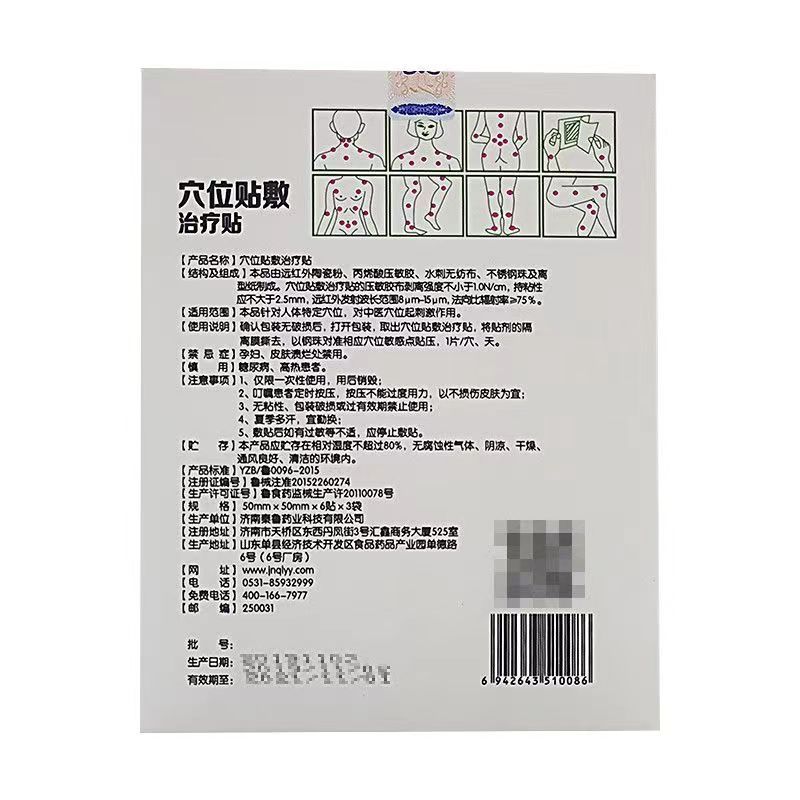| 使用方法 | 1、清潔相應(yīng)穴位,先以拇指依次揉按相應(yīng)穴位,每穴1~2分鐘,范圍由小到大,力量由輕到重,探尋敏感點(diǎn)。2、確認(rèn)包裝無破損后,打開包裝,取出穴位貼敷治療貼,將貼劑的隔離膜撕去,以鋼珠對(duì)準(zhǔn)相應(yīng)穴位敏感點(diǎn)貼壓,1片/穴、天,每日適度按壓3~5次,每次3~5分鐘,1個(gè)療程為10天,療程間隔2~3天。 |