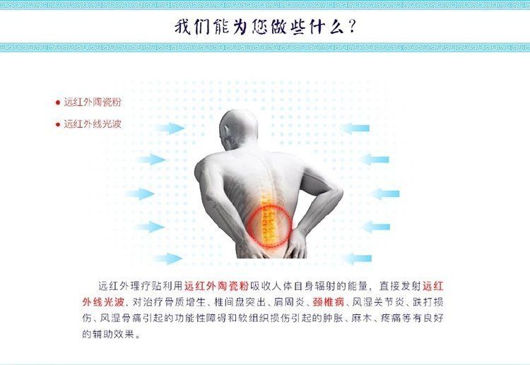 | 產(chǎn)品用途 | 虎今通遠(yuǎn)紅外理療貼主要針對頸椎病,肩周炎,腰間盤突出,骨質(zhì)增生,軟骨織損傷,風(fēng)濕性關(guān)節(jié)具有很好的輔助治療的作用。 |