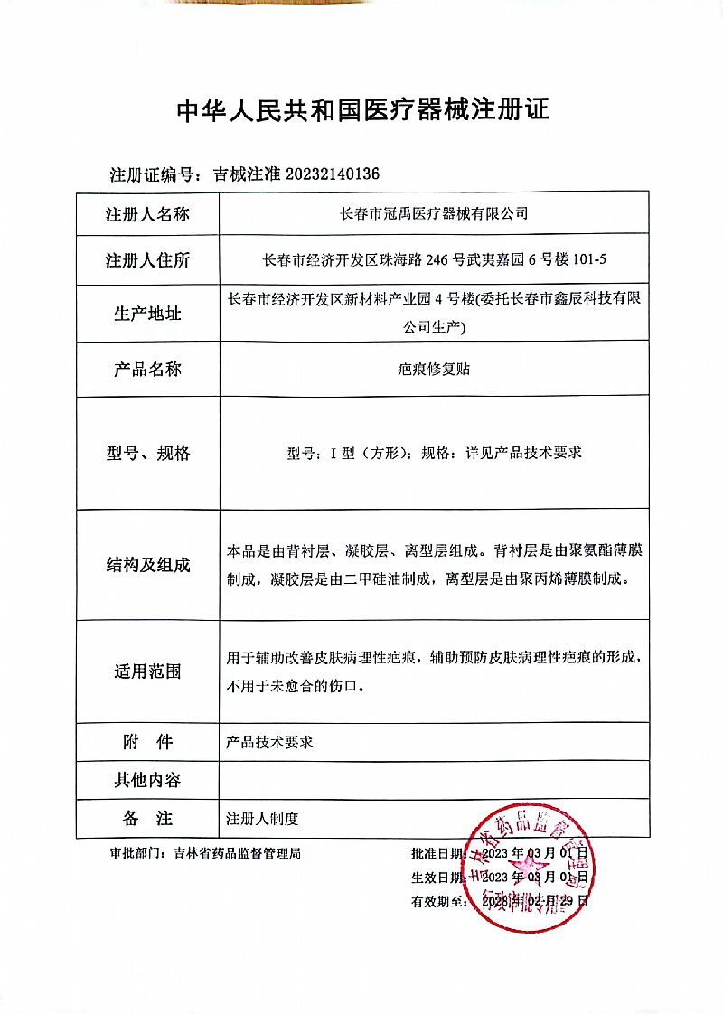 | 補(bǔ)充說(shuō)明 | 【產(chǎn)品名稱】疤痕修復(fù)貼 【型號(hào)、規(guī)格】Ⅰ型(方形):2cm×2cm、3cm×3cm、4cm×4cm、5cm×5cm、7.5cm×7.5cm、10cm×10cm、12.5cm×12.5cm、1.5cm×5cm、2cm×6cm、2cm×12cm、2.5cm×6.5cm、3cm×7cm、3cm×8cm、3cm×12cm、3.5cm×5.5cm、4cm×5cm、4cm×10cm、4cm×12cm、4cm×15cm、4cm×20cm、4cm×25cm、4cm×30cm、15cm×20cm、10cm×15cm、10cm×20cm、10cm×25cm、10cm×30cm、10cm×35cm、5cm×10cm、5cm×12cm、5cm×18cm、5cm×20cm、6cm×12cm、7cm×9.5cm、8cm×12cm、8cm×20cm、10cm×12cm、12cm×15cm、12cm×16cm、12cm×21cm、5cm×7.5cm、7.5cm×10cm、15cm×20cm、20cm×25cm、20cm×30cm、10cm×40cm、12.5cm×20cm、15cm×18cm。允差:±10%。 【結(jié)構(gòu)及組成】本品是由背襯層、凝膠層、離型層組成。背襯層是由聚氨酯薄膜制成,凝膠層是由二甲硅油制成,離型層是由聚丙烯薄膜制成。 【產(chǎn)品性能】外觀:凝膠應(yīng)涂布均勻,凝膠面應(yīng)光潔,色澤一致,無(wú)脫落、失黏現(xiàn)象;背襯面應(yīng)平整、潔凈、無(wú)漏凝膠現(xiàn)象。pH值:應(yīng)為5.0~7.0。其他內(nèi)容詳見(jiàn)產(chǎn)品技術(shù)要求。 【適用范圍】用于輔助改善皮膚病理性疤痕,輔助預(yù)防皮膚病理性疤痕的形成,不用于未愈合的傷口。 【使用方法】1.使用前先將疤痕部位清洗干凈并擦干;2.依疤痕大小形狀選取合適大小的產(chǎn)品,撕開(kāi)內(nèi)包裝,小心揭開(kāi)貼在粘膠上的隔離紙或隔離膜,將粘膠層粘貼于疤痕部位;3.為使皮膚適應(yīng),開(kāi)始使用**天建議使用2-4小時(shí),以后每天增加4小時(shí),可逐漸增至24小時(shí)貼敷。 【禁 忌 癥】對(duì)本品過(guò)敏者禁用。 【注意事項(xiàng)】1.對(duì)本品成份過(guò)敏者慎用;2.如出現(xiàn)不適,請(qǐng)停止使用或遵醫(yī)囑。 【特殊儲(chǔ)存、運(yùn)輸條件、方法】密閉、常溫貯存;常溫運(yùn)輸。 【產(chǎn)品批號(hào)/生產(chǎn)日期/失效日期】見(jiàn)包裝盒 【使用期限】三年 |