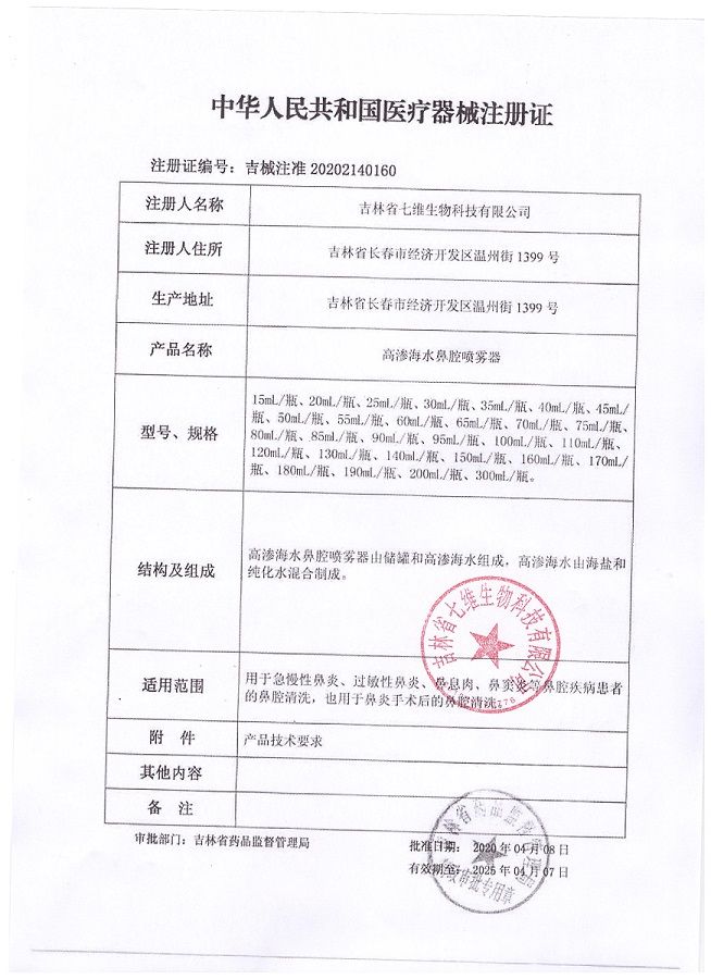 | 主要成分 | 高滲海水鼻腔噴霧器由儲罐和高滲海水組成,高滲海水由海鹽和純化水混合制成。 |