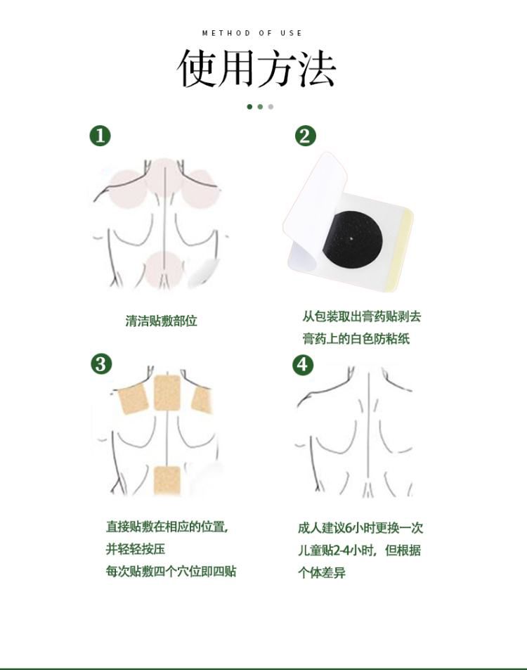 | 使用方法 | 三伏貼敷療法3~5年為一個療程。每年分為三個階段,即頭伏、中伏和末伏。一般每伏貼敷3次,每次貼4個穴位,即貼4片。兒童每次貼2~4小時,成人每次貼6小時。但根據(jù)個體差異、患者的病情,醫(yī)生會對貼敷時間、次數(shù)做適當(dāng)調(diào)整。 |
