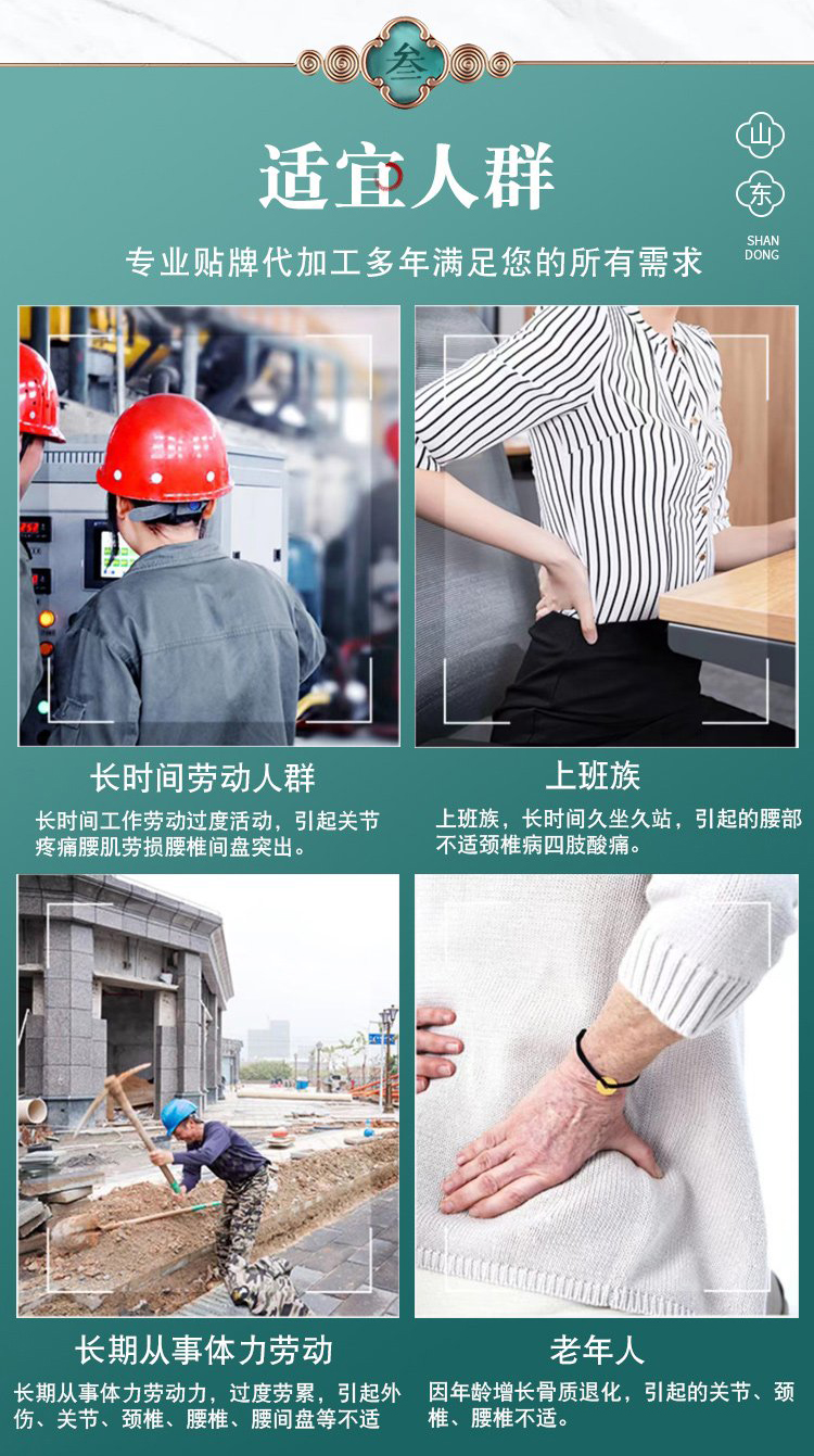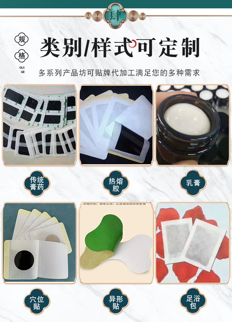 | 補充說明 | 更多 **規(guī)格膏藥貼/異形貼/穴位貼/黑膏貼/oem貼牌代加工 |