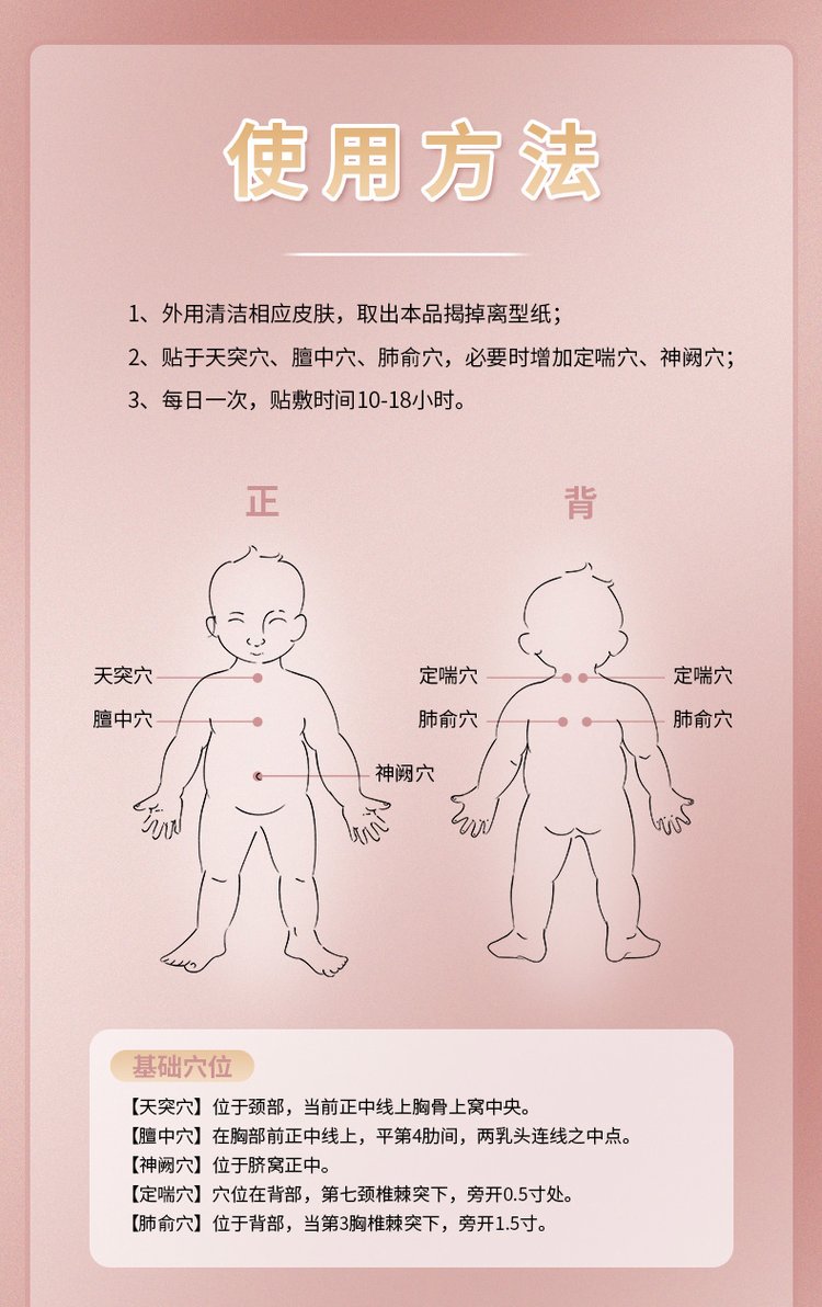 | 使用方法 | 使用方法1、清潔相應(yīng)穴位,先以拇指依次揉按相應(yīng)穴位,每穴1~2分鐘,范圍由小到大,力量由輕到重,探尋敏感點(diǎn)。2、確認(rèn)包裝無(wú)破損后,打開(kāi)包裝,取出穴位貼敷治療貼,將貼劑的隔離膜撕去,以鋼珠對(duì)準(zhǔn)相應(yīng)穴位敏感點(diǎn)貼壓,1片/穴、天,每日適度按壓3~5次,每次3~5分鐘,1個(gè)療程為10天,療程間隔2~3天。 |