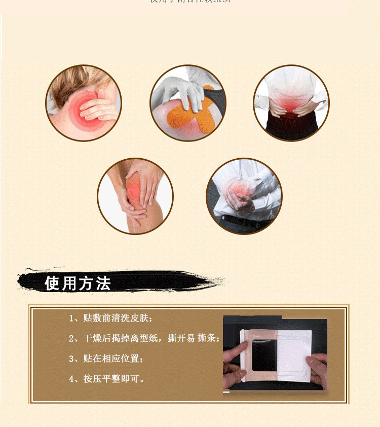 | 使用方法 | 使用方法清潔患處,確認包裝無破損后,打開包裝,取出遠紅外理療貼,將貼劑的隔離膜撕去,貼于患處,貼敷時間見表 |