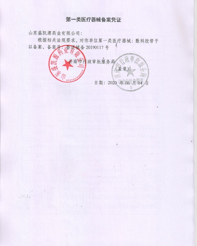 | 補充說明 | 【產(chǎn)品名稱】醫(yī)用膠布 【型號規(guī)格】SKY-A型:2.5cm×2.5cm、3cm×3cm、4cm×4cm、5cm×5cm、6cm×6cm、7cm×7cm、3cm×5cm、4cm×5cm、5cm×7cm、6cm×9cm、7cm×10cm、8cm×10cm、8cm×12cm、9cm×13cm、10cm×14cm、14cm×16cm、16cm×18cm; SKY-B型:3cm×5cm、4cm×5cm、5cm×7cm、7cm×10cm、8cm×12cm、10cm×14cm、14cm×16cm、16cm×20cm 【包 裝】6貼/盒、8貼/盒、10貼/盒、16貼/盒、20貼/盒、30貼/盒、50貼/盒、 60貼/盒、80貼/盒、100貼/盒、120貼/盒、 【產(chǎn)品描述】產(chǎn)品為背材上涂有具有自粘特性的膠粘劑的膠帶。部分膠帶涂膠面有保護(hù)層。非無菌提供,一次性使用。不與創(chuàng)面直接接觸。粘貼部位為完好皮膚。 【主要成分】該產(chǎn)品由黏貼層、防漏圈和隔離層組成。 【適用范圍】用于將敷料粘貼固定于創(chuàng)面或?qū)⑵渌t(yī)療器械固定到人體的特定部位。 【適用人群】 SKY-A 型:適用于穴位貼敷治療的固定,可作為三伏貼、三九貼的穴位貼敷部位和藥物的固定作用。 SKY-B型:適用于人體皮膚表面的碰傷、擦傷、割傷等外傷引起的創(chuàng)傷敷料或藥物的固定,不與創(chuàng)面直接接觸。 【注意事項】1)僅供外用,請勿用于破損、曬傷或有炎癥的皮膚上,皮膚過敏者慎用。 2)本品為一次性使用產(chǎn)品。 3)請置于兒童不能接觸到的地方。 【使用說明】定準(zhǔn)穴位,用溫水將局部洗凈,或用乙醇棉球擦凈,采取適當(dāng)體位,使藥物或敷料能敷貼穩(wěn)妥,可作為穴位貼敷治療貼、三伏貼、三九貼使用也可協(xié)助藥物固定使用本品。 【禁 忌 癥】對本產(chǎn)品任何成份過敏者禁用。 【有 效 期】24個月 【貯 藏】密封,通風(fēng)、置常溫干燥處保存。 【生產(chǎn)備案憑證編號】魯濟(jì)食藥監(jiān)械生產(chǎn)備20140021 號 【醫(yī)療器械備案憑證編號】魯濟(jì)械備20180597號 【產(chǎn)品技術(shù)要求編號】魯濟(jì)械備20180597號 |