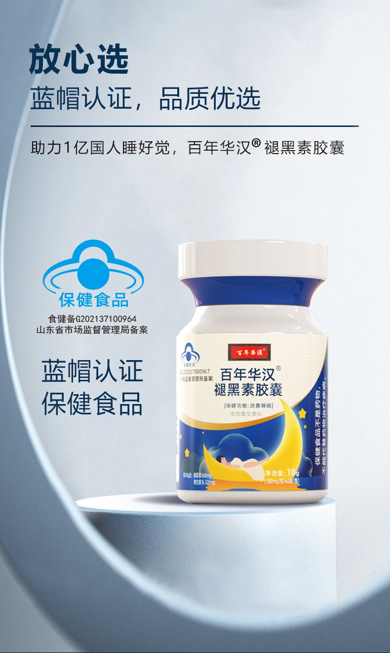 | 補充說明 | 百年華漢褪黑素膠囊,每粒含褪黑素1.98mg,維生素B6 0.96mg ,符合衛(wèi)生組織建議服用范圍,科學(xué)配比,精準(zhǔn)服用,人群選擇更靈活 |