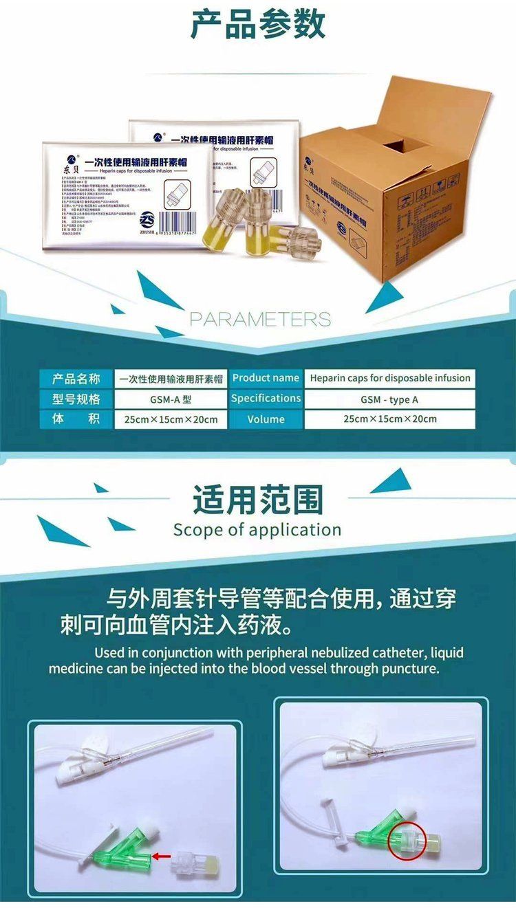 | 使用方法 | 1.打開單包裝,取出一次性使用輸液用肝素帽; 2.把肝素帽與6%(魯爾)內(nèi)圓錐接頭的連接件連接并按順時針方向旋轉(zhuǎn)肝素帽,確保密封良好; 3.對肝素帽的穿刺區(qū)域進行消毒; 4.將針頭刺入穿刺區(qū)域,穿過密封膠墊; 5.進行無菌注射,注射完畢,拔出針頭,將準備好的肝素液用注射器通過密封膠墊注入留置針,注入時應邊注入邊緩緩退出鋼針,保證肝素液充滿留置針,起到封堵血液、防止血液凝固的作用。 6.若進行多次注射,重復2-5的步驟。 |