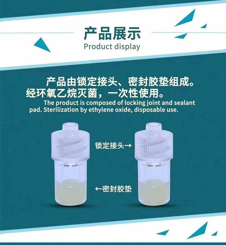 | 主要成分 | 產(chǎn)品由鎖定接頭、密封膠墊組成。經(jīng)環(huán)氧乙烷滅菌,一次性使用。 |