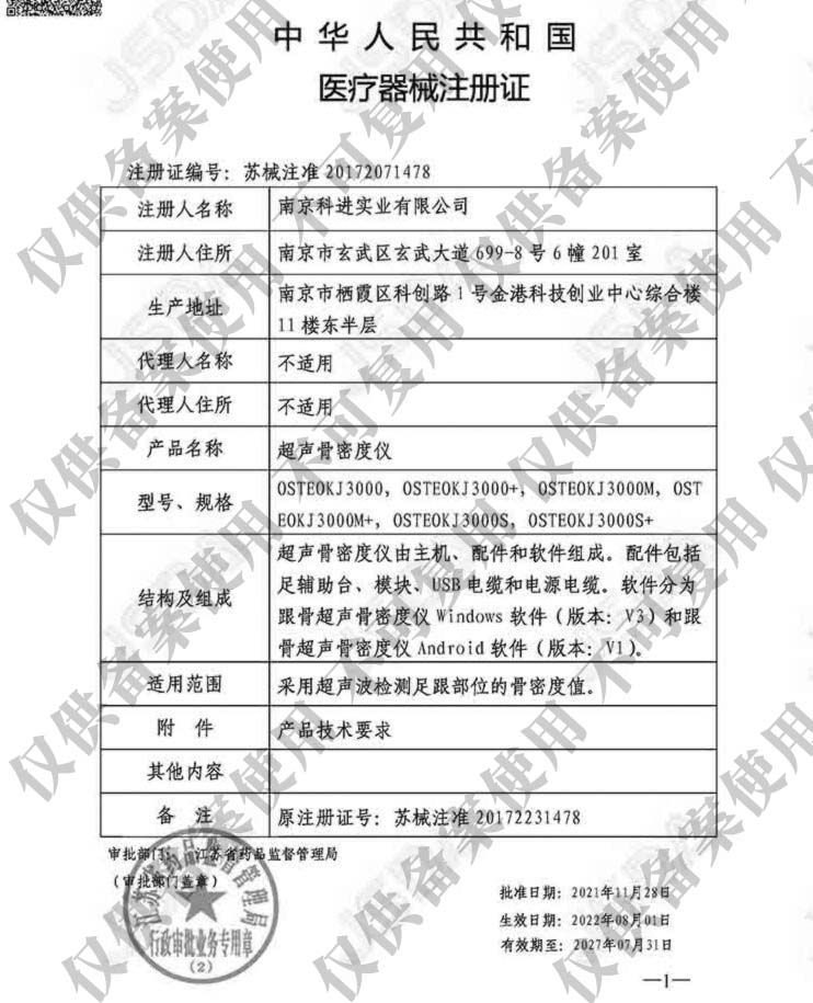 | 補(bǔ)充說明 | OSTEOKJ3000S+超聲骨密度儀是南京科進(jìn)實業(yè)有限公司推出的跟骨骨密度檢測產(chǎn)品,設(shè)備延續(xù)了跟骨骨密度系列產(chǎn)品的設(shè)計,造型動感美觀,配備10.1寸觸摸屏、內(nèi)置揚聲器、快速熱敏打印機(jī),操作方便快捷。 本產(chǎn)品適用于各類醫(yī)療和體檢機(jī)構(gòu),能夠提供骨質(zhì)參數(shù),檢測中老年人骨質(zhì),有效評估青少年兒童的骨骼發(fā)育狀況。 【產(chǎn)品優(yōu)勢】 配備10.1寸觸摸屏,無需連接顯示器,為您節(jié)省更多空間。 配備內(nèi)置快速熱敏打印機(jī),打印報告僅需兩*。 內(nèi)置電腦主機(jī), 主持WindowsXP/7/8/10操作系統(tǒng)。 跟骨檢測,數(shù)據(jù)準(zhǔn)確,重復(fù)性好。 |