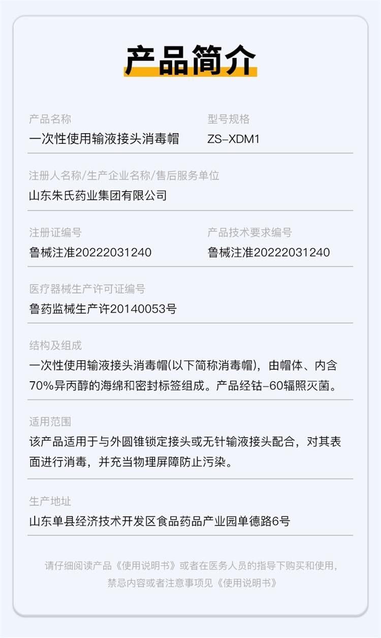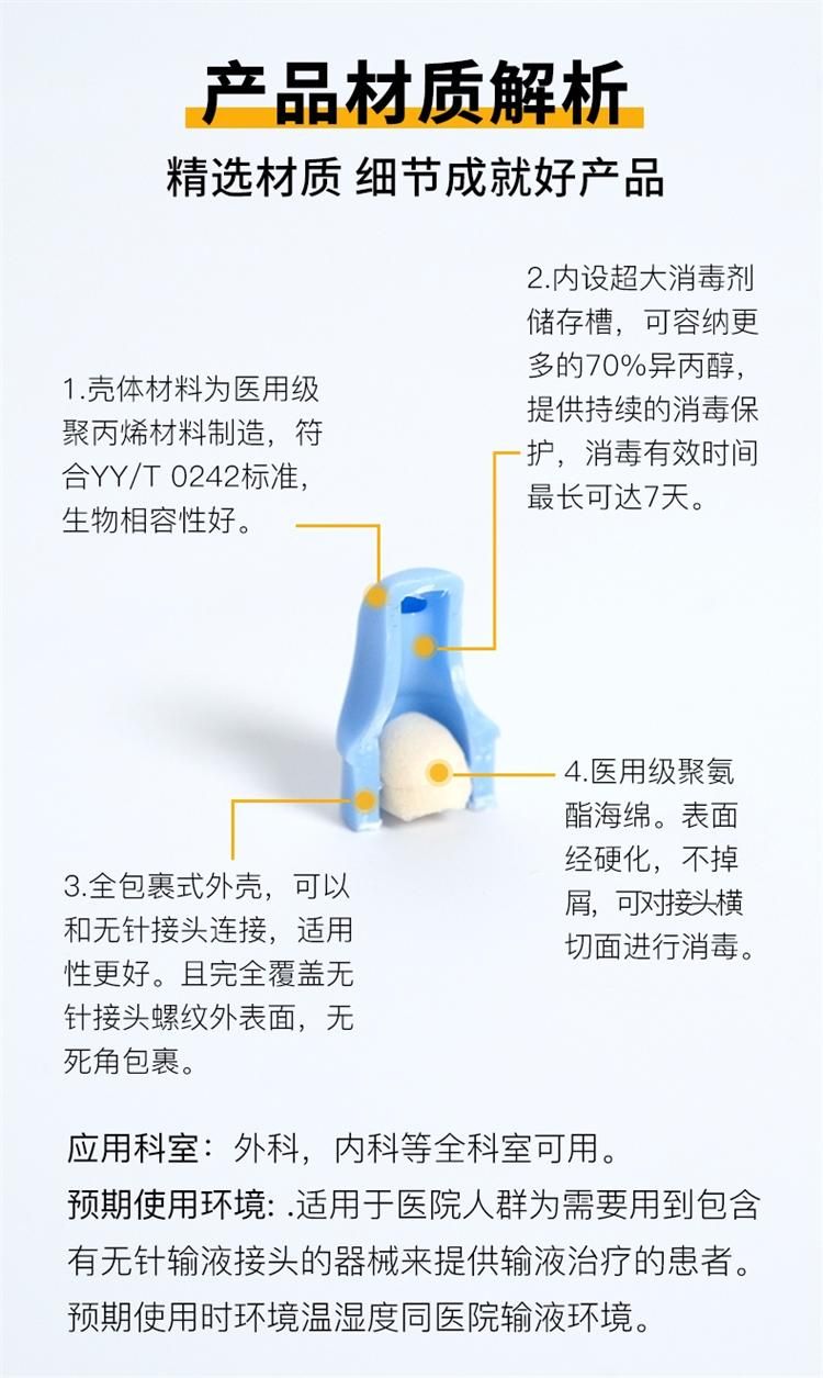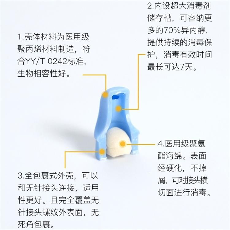 | 使用方法 | 1.使用時(shí),取下消毒帽,揭開鋁箔紙,將其與無針輸液接頭或外圓錐鎖定接頭連接固定。 2.再次輸液時(shí),旋下消毒帽,待無針輸液接頭或外圓錐鎖定接頭晾干后與其它輸注器具相連接。 |