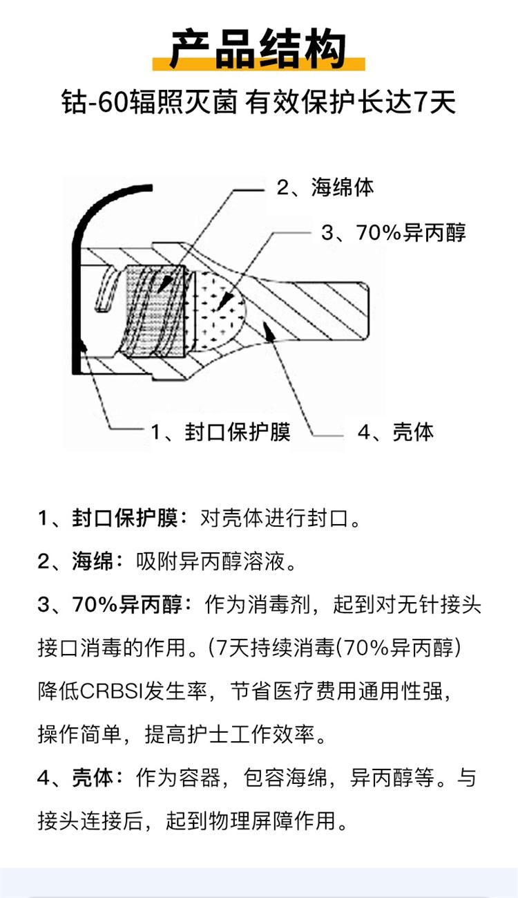 | 主要成分 | 一次性使用輸液接頭消毒帽(以下簡稱消毒帽),由帽體、內(nèi)含70%異丙醇的海綿和密封標(biāo)簽組成。產(chǎn)品經(jīng)鈷-60輻照滅菌。 |