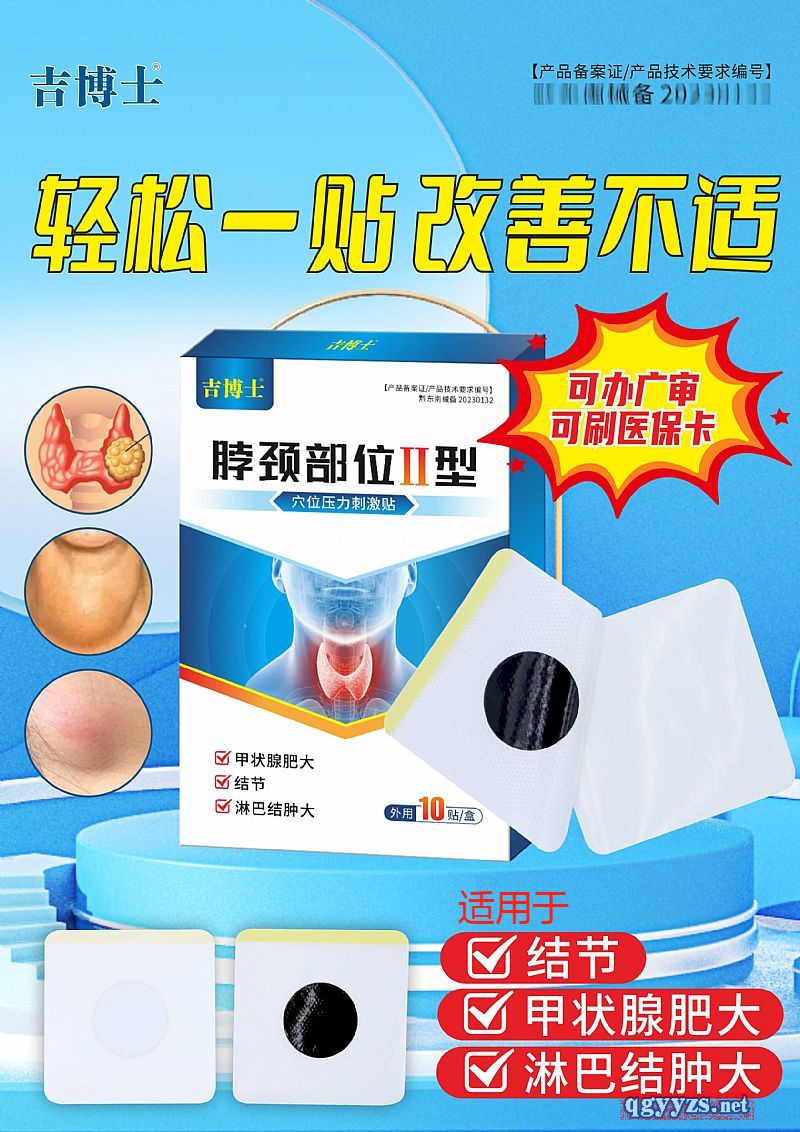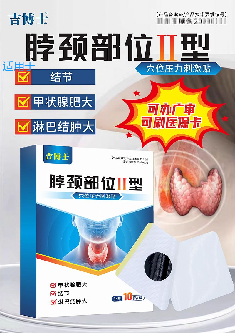 | 產(chǎn)品用途 | 【適用人群】適用于甲狀腺肥大、結(jié)節(jié)、淋巴結(jié)腫大不適人群相關(guān)穴位。 |