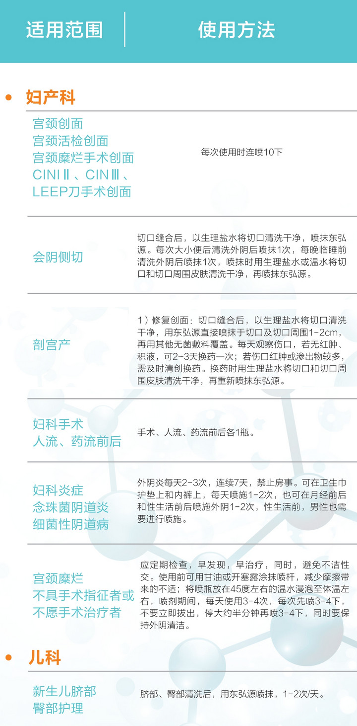 | 補(bǔ)充說明 | 東弘源醫(yī)用功能性敷料是獲得二類醫(yī)療器械注冊證的、大小切口和手術(shù)切口縫合后使用的無菌傷口液體敷噴劑,透氣、防水、保濕、、快速成膜,可提供生長修復(fù)的營養(yǎng)物質(zhì)和支架。 科室應(yīng)用: 1、婦產(chǎn)科:宮頸創(chuàng)面、宮頸活檢創(chuàng)面、宮頸糜爛手術(shù)創(chuàng)面、利普刀手術(shù)創(chuàng)面、剖腹產(chǎn)、人流及藥流前后、婦科炎癥等。 2、新生兒科、兒科:新生兒臍帶護(hù)理、嬰幼兒臂部護(hù)理等。 3、門診、普外科、骨科:腹腔鏡微創(chuàng)切口、各損傷切口、手術(shù)切口、肛腸創(chuàng)面等。 4、燒傷科、燒傷整形美容科:燒傷、燙傷創(chuàng)面。要注意燒燙臨床分期,在滲出期建議不使用本品,而在修復(fù)期、疤痕期可使用本品。 5、皮膚科、性病科:皮炎等感染性皮膚病、梅毒與尖銳濕疣等性病、淺部真菌感染等。視病情需要可同時(shí)全身應(yīng)用抗生素,東弘源二類液體傷口敷料噴劑可單獨(dú)外用,也可配合其它外用藥聯(lián)合使用。 6、口腔科、五官科:口腔手術(shù)前后預(yù)防感染,牙周炎治療,潔牙后預(yù)防牙齒牙齦感染,口腔潰瘍治療等。 7、腫瘤科:放療、化療前,放療皮膚潰瘍等。 8、內(nèi)分泌科等:慢性潰瘍、褥瘡、下肢靜脈潰瘍、糖尿病足等。 滅菌方式:作為械字號二類液體敷料,東弘源醫(yī)用功能性敷料經(jīng)高溫濕熱滅菌,已滅菌。 |