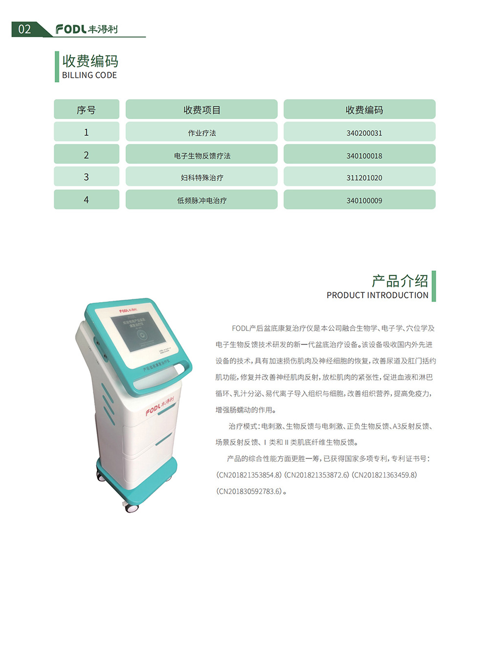 | 補(bǔ)充說明 | FODL產(chǎn)后盆底康復(fù)治療儀是本公司融合生物學(xué)、電子學(xué)、穴位學(xué)及電子生物反饋技術(shù)研發(fā)的新一代盆底治療設(shè)備。該設(shè)備吸收國(guó)內(nèi)外設(shè)備的技術(shù),具有加速損傷肌肉及神經(jīng)細(xì)胞的恢復(fù),改善尿道及肛門括約肌功能,修復(fù)并改善神經(jīng)肌肉反射,放松肌肉的緊張性,促進(jìn)血液和淋巴循環(huán)、乳汁分泌、易代離子導(dǎo)入組織與細(xì)胞。 治療模式:電刺激、生物反饋與電刺激、正負(fù)生物反饋、A3反射反饋、場(chǎng)景反射反饋、1類和Ⅱ類肌底纖維生物反饋。 產(chǎn)品的綜合性能強(qiáng),已獲得多項(xiàng)專利: 專利號(hào):CN201821353854.8,[中國(guó)實(shí)用新型],一種女性盆底功能評(píng)估棒 專利號(hào):CN201821353872.6,[中國(guó)實(shí)用新型],一種產(chǎn)后康復(fù)治療棒 專利號(hào):CN201821363459.8,[中國(guó)實(shí)用新型],一種產(chǎn)后治療裝置 專利號(hào):CN201830592783.6,[中國(guó)外觀],陰道治療電極棒 |