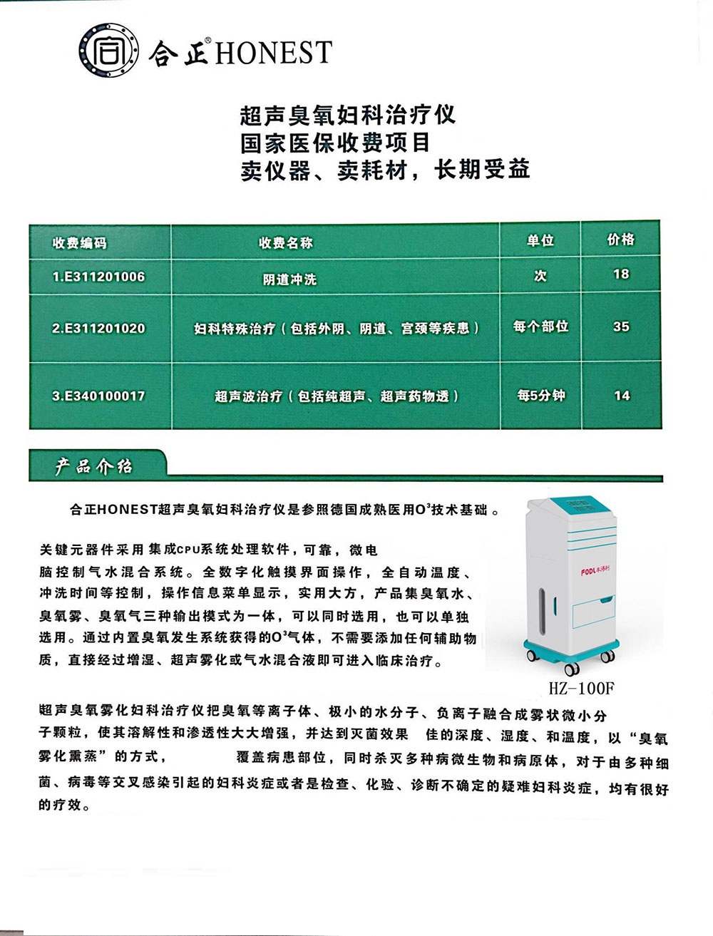| 產(chǎn)品賣點(diǎn) | 超聲臭氧婦科治療儀國家醫(yī)保收費(fèi)項(xiàng)目賣儀器、賣耗材 產(chǎn)品說明:配專用理療電極片耗材,該耗材也獲國家發(fā)明專利。 專利證書號(hào):ZL2011.1.018046.0 收費(fèi)編碼:E311201006 適合科室:婦科 |