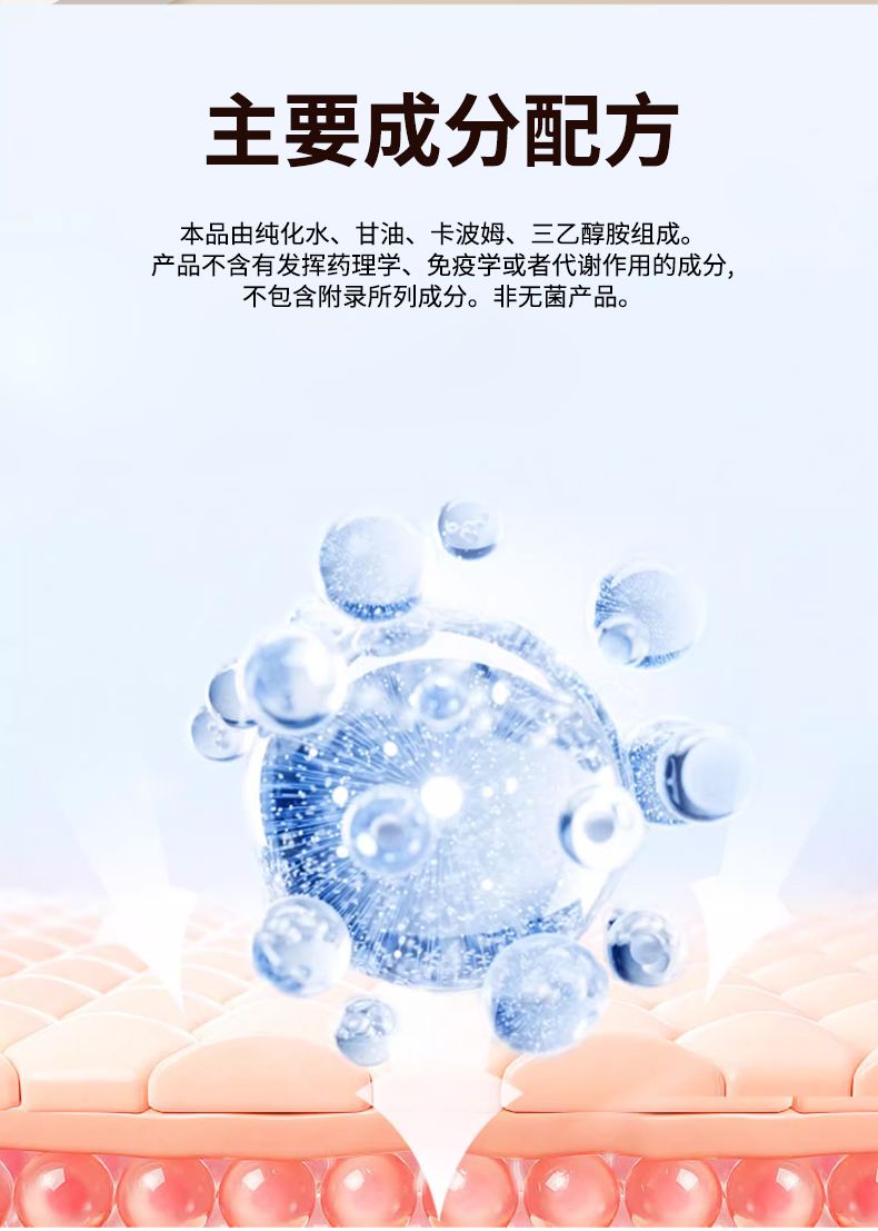 | 主要成分 | 本品由純化水、甘油、卡波姆、三乙醇胺組成。產(chǎn)品不含有發(fā)揮藥理學(xué)、免疫學(xué)或者代謝作用的成分,不包含附錄所列成分。非無菌產(chǎn)品。 |
