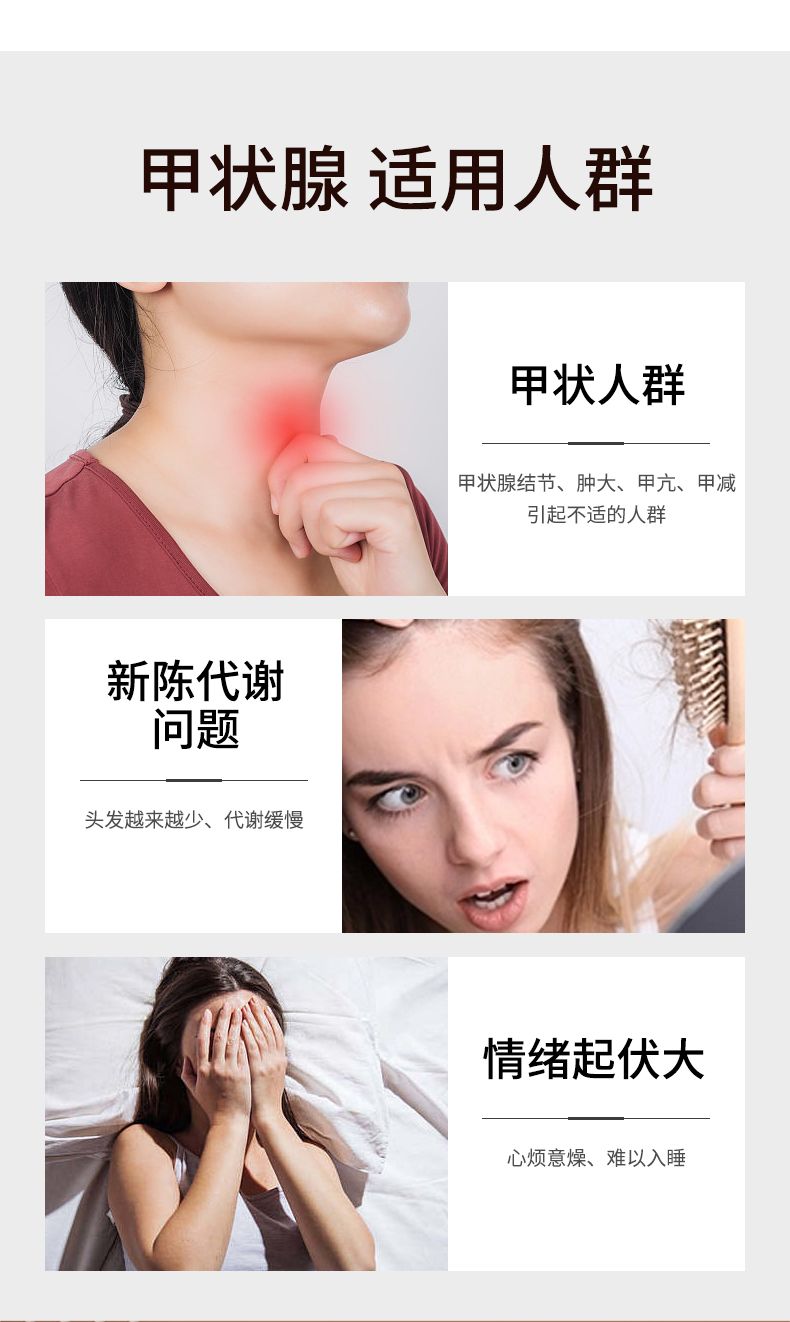| 產(chǎn)品用途 | 適用于甲狀腺結(jié)節(jié)、腫大、甲亢、甲減引起不適的人群。 |