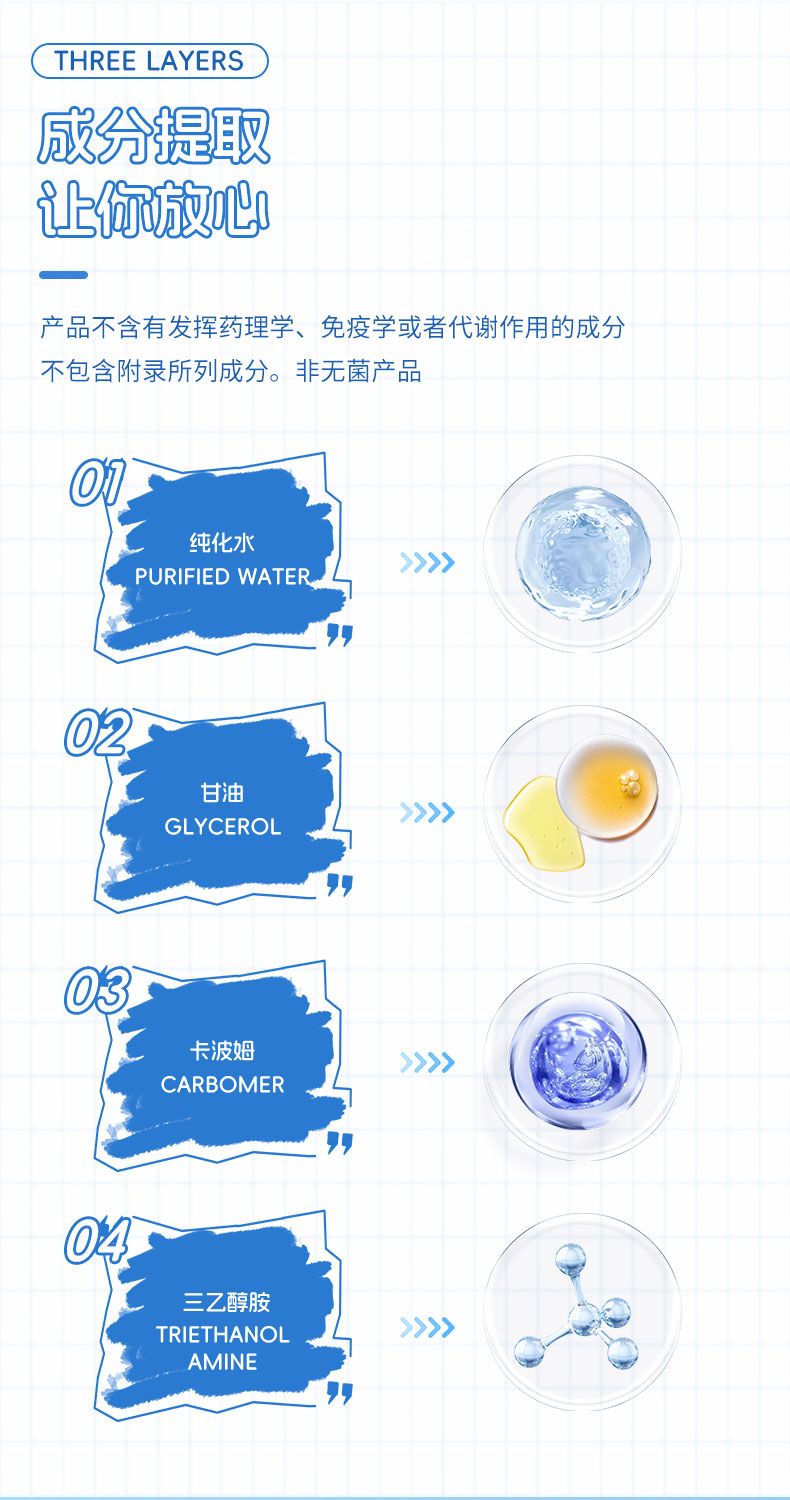 | 主要成分 | 本品由純化水、甘油、卡波姆、三乙醇胺組成。產(chǎn)品不含有發(fā)揮藥理學(xué)、免疫學(xué)或者代謝作用的成分,不包含附錄所列成分。非無菌產(chǎn)品。 |