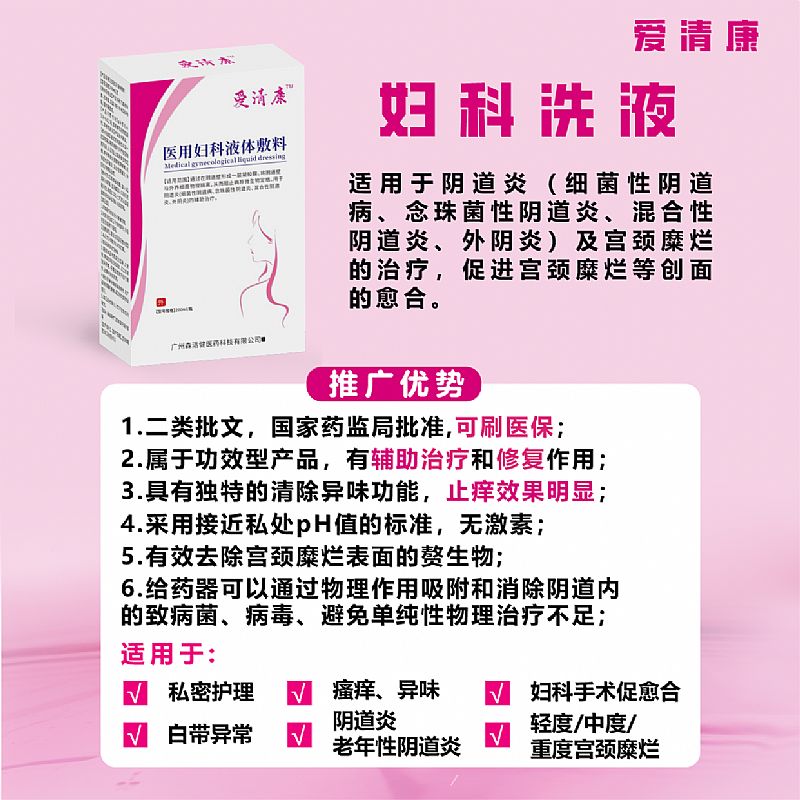 | 產(chǎn)品賣點(diǎn) | 婦科HPV洗液、陰道炎宮頸炎治療、正規(guī)二類器械批文、適應(yīng)癥明確、一區(qū)一碼,嚴(yán)格控銷、適用范圍清晰。 1.二類批文,國(guó)家藥監(jiān)局批準(zhǔn),可刷醫(yī)保; 2.屬于功效型產(chǎn)品,有輔助治療和修復(fù)作用; 3.具有獨(dú)特的清除異味功能,止癢效果明顯; 4.采用接近私處pH值的標(biāo)準(zhǔn),無(wú)激素; 6.給藥器可以通過(guò)物理作用; |