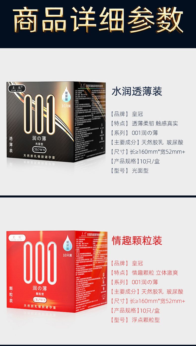 | 補(bǔ)充說明 | 皇冠避孕套采用天然乳膠為原料經(jīng)加工制成,潤滑劑為二甲基硅油,對天然乳膠過敏者慎用,或使用前咨詢醫(yī)生,該避孕套為一次性用品,切勿重復(fù)使用,使用后請妥善棄置。該避孕套潤滑劑中不含殺精劑或藥物成分;使诒茉刑自谡_使用下,有助于降低受孕風(fēng)險(xiǎn)及減少某些性傳播疾病感染的風(fēng)險(xiǎn)。 |