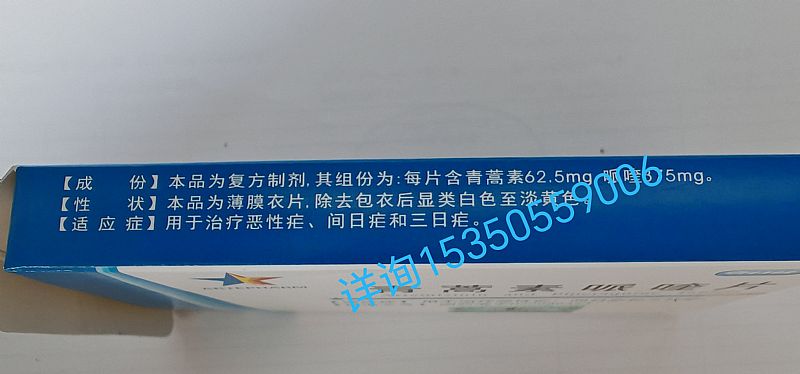 | 主要成分 | 本品為復(fù)方制劑,其組份為:每片含青蒿素62.5mg,哌喹375mg。 |