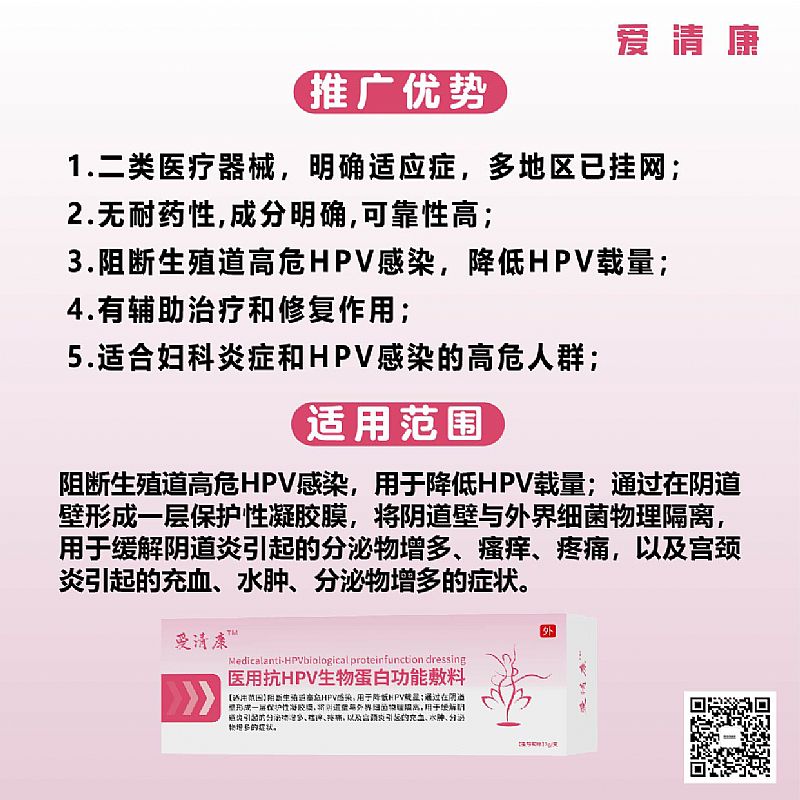| 產(chǎn)品賣點(diǎn) | 阻斷高危HPV降低載量、正規(guī)二類器械批文、明確適應(yīng)癥、多地區(qū)已掛網(wǎng)、嚴(yán)格控銷。 1.二類批文,國家藥監(jiān)局批準(zhǔn),可刷醫(yī)保; 2.不屬于藥物,無耐藥性,成分明確,可靠性更高; 3.阻斷生殖道高危HPV感染,降低HPV載量; 4.采用接近私處pH值的標(biāo)準(zhǔn),無激素; 5.屬于功效型產(chǎn)品,有輔助治療和修復(fù)作用; 6.適合反復(fù)感染婦科炎癥和HPV感染的高危人群;控銷; |