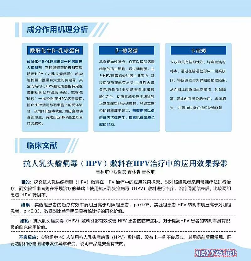 | 作用機(jī)理 | 酸酐化牛β-乳球蛋白與HPV衣殼蛋白結(jié)合,從而導(dǎo)致HPV衣殼蛋白結(jié)構(gòu)象變化而失活,同時(shí)阻止病毒與宿主細(xì)胞的結(jié)合,從而阻止HPV感染降低HPV病毒載量。 β-葡聚糖具有靶向性特點(diǎn),使病毒感染宿主細(xì)胞的正常生理功能受到影響,導(dǎo)致其感染的宿主細(xì)胞凋亡。也有提高機(jī)體體液免疫的能力。 卡博姆本身是一種天然藥物成分,能殺菌消炎,覆蓋糜爛組織,可表面形成保護(hù)膜吸附,并將失活HPV病毒包裹排出體外。 |