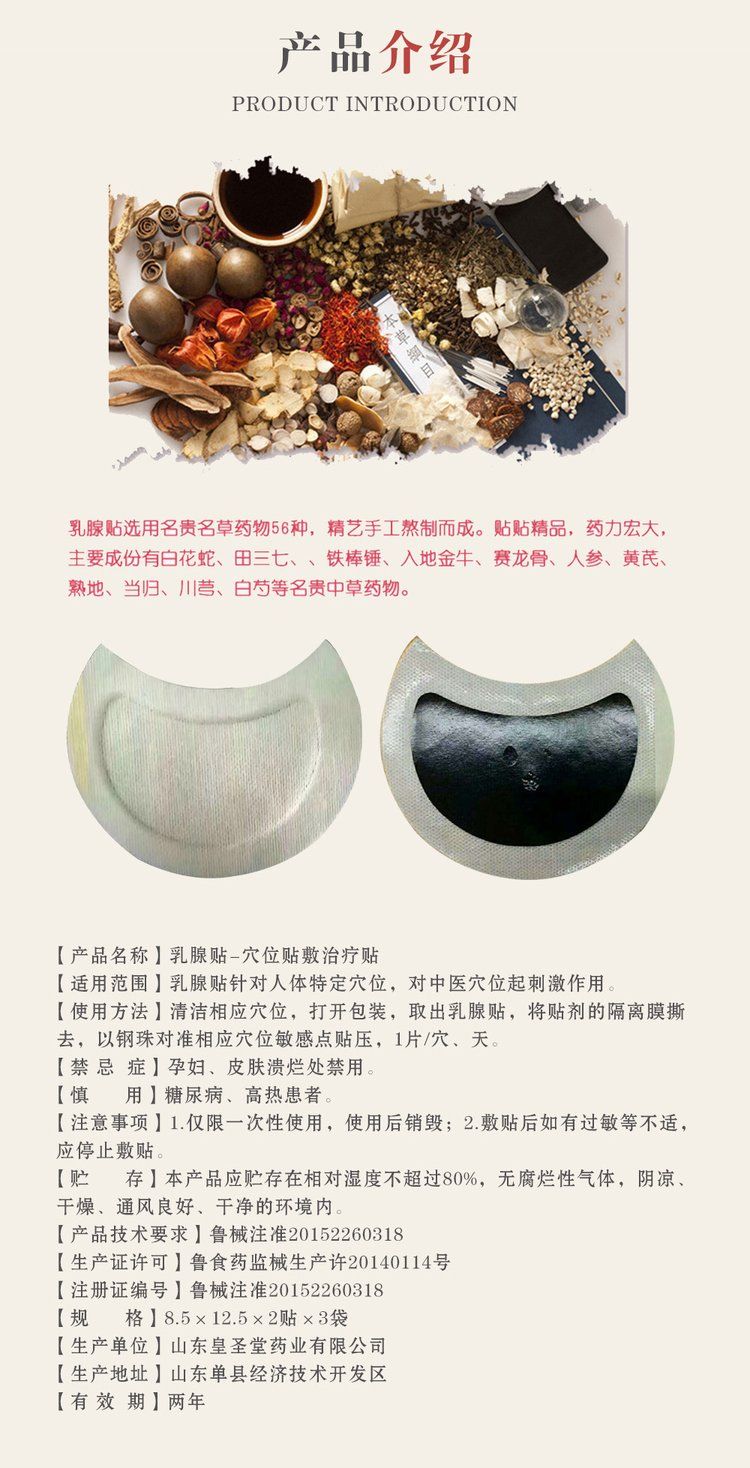 | 補(bǔ)充說明 | A、規(guī)格: 95cm×13cm×3 貼/袋×2 袋/盒×300 盒/ 件 B、注冊證號: 魯械注準(zhǔn) 20152090308 號 C、適用范圍: 乳腺增生、乳房結(jié)塊、乳腺纖維瘤、乳房腫脹疼痛、乳腺囊性增生、小葉增生。 D、特點(diǎn): 1、不口服不動韌,靶向滲透,局部帶動整體。 2、直接從乳腺入手,調(diào)節(jié)微循環(huán)。 |