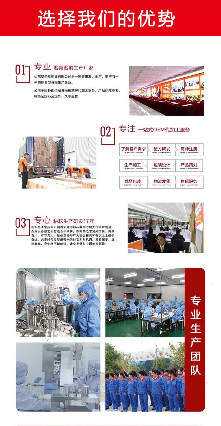- 海旭醫(yī)療主要承接各類暖宮貼定制、遠(yuǎn)紅外理療貼代加工、磁療貼貼牌加工、穴位敷貼廠家、灸熱貼代加工、退熱貼代加工、燙熨治療包定制、小兒咳 喘腹瀉膏藥定制加工、艾灸貼定制、化妝品定制、保健食品定制、噴劑、乳膏類加 工等醫(yī)院臨床和終端診所所需的系列產(chǎn)品。公司的經(jīng)營范圍有:骨科,婦科、男科、手術(shù)科、五官科和小兒科等。