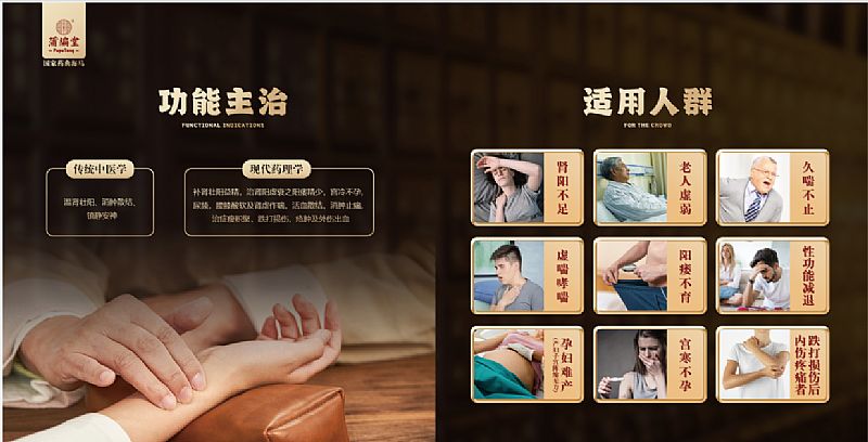 | 產品用途 | 溫腎壯陽、消腫散結、鎮(zhèn)靜安神。 補腎壯陽益精,治腎陽虛衰之陽痿精少,宮冷不孕,尿頻,腰膝酸軟及腎虛作喘,活血散結,消腫止痛,治癥瘦積聚,跌打損傷,瘡腫及外傷出血。 |