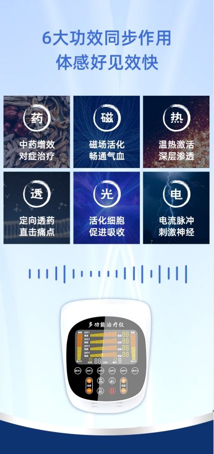 | 作用機理 | 定向透藥直擊痛點,活化細胞促進吸收,電流脈沖刺激神經(jīng),磁場活化暢通氣血,溫熱激活深層滲透,中藥增效對癥治療 |
