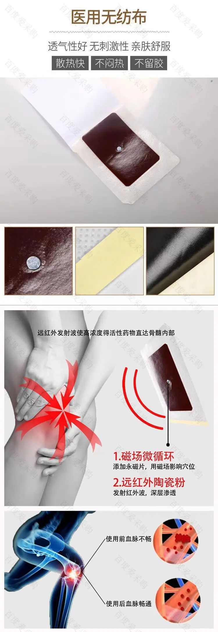 | 主要成分 | 磁療貼由遠紅外陶瓷粉、永磁片、透氣膠布、防粘紙組成。永磁片為釹鐵硼永磁體,透氣膠布用壓敏膠和無紡布制成 |