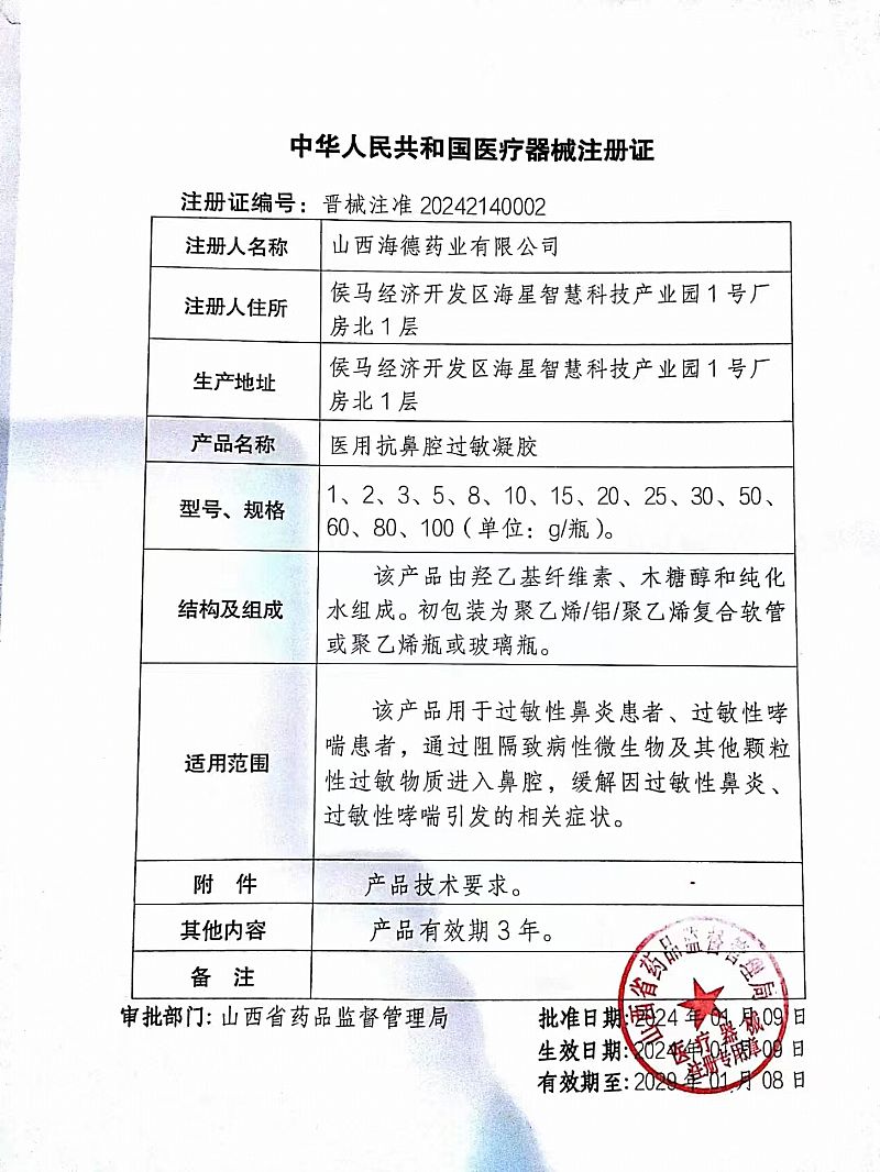 | 產(chǎn)品賣點 | 醫(yī)用抗鼻腔過敏凝膠,二類械字號新批文,該產(chǎn)品用于過敏性鼻炎患者、過敏性哮喘患者,通過阻隔致病性微生物及其他顆粒性過敏物進入鼻腔,緩解因過敏性鼻炎、過敏性哮喘引發(fā)的相關(guān)癥狀輔助治療。三年效期,山西海德藥業(yè)廠家直銷,可以貼牌代加工,可刷醫(yī)? |