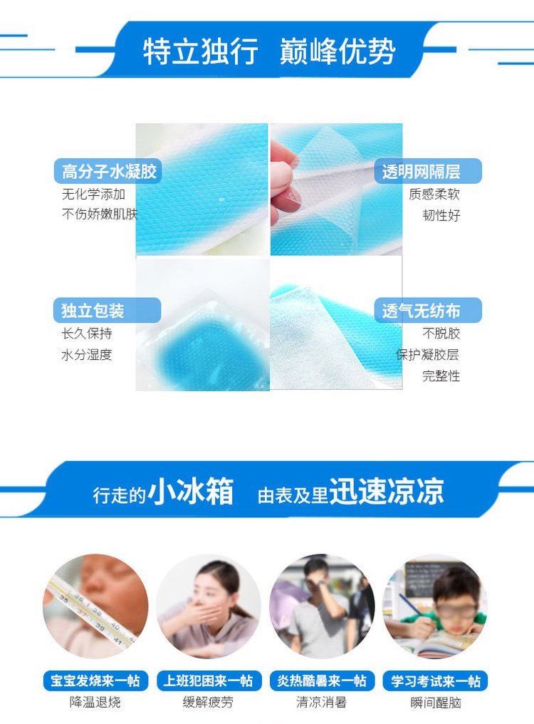 | 主要成分 | 本品由無紡布背襯層、凝膠層、聚乙烯薄膜覆蓋層組成。凝膠層由聚丙烯酸鈉、聚乙烯吡咯烷酮(液體)、甘羥鋁、甘油、食品添加著色劑(藍(lán)色)、純化水組成。降溫物質(zhì)不含有發(fā)揮藥理學(xué)、免疫學(xué)或者代謝作用的成分。非無菌產(chǎn)品。 |