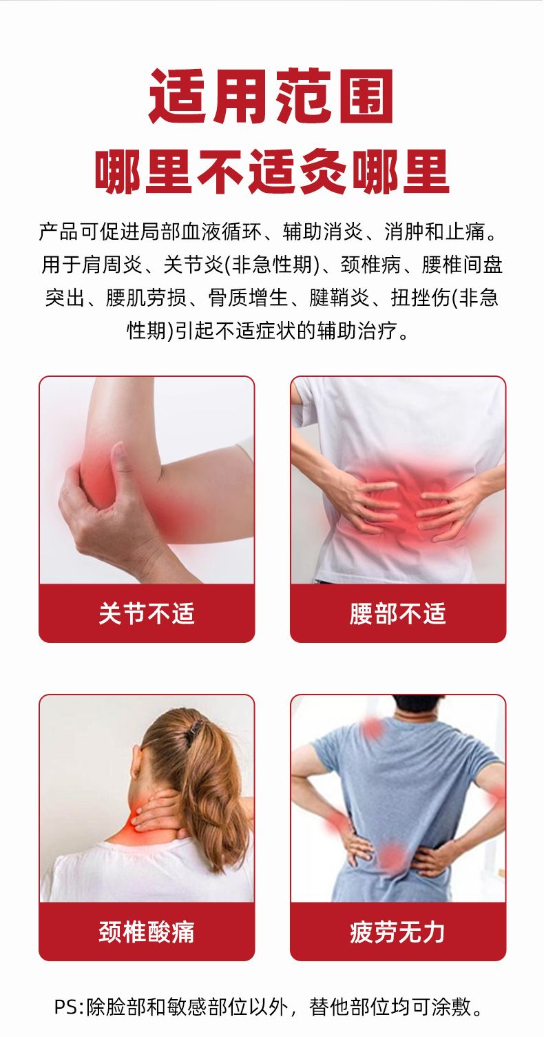 | 產(chǎn)品用途 | 該產(chǎn)品可促進(jìn)局部血液循環(huán)、輔助消炎、消腫和止痛。用于肩周炎、關(guān)節(jié)炎(非急性期)、頸椎病、腰椎間盤(pán)突出、腰肌勞損、骨質(zhì)增生、腱鞘炎、扭挫傷(非急性期)引起不適癥狀的輔助治療 |