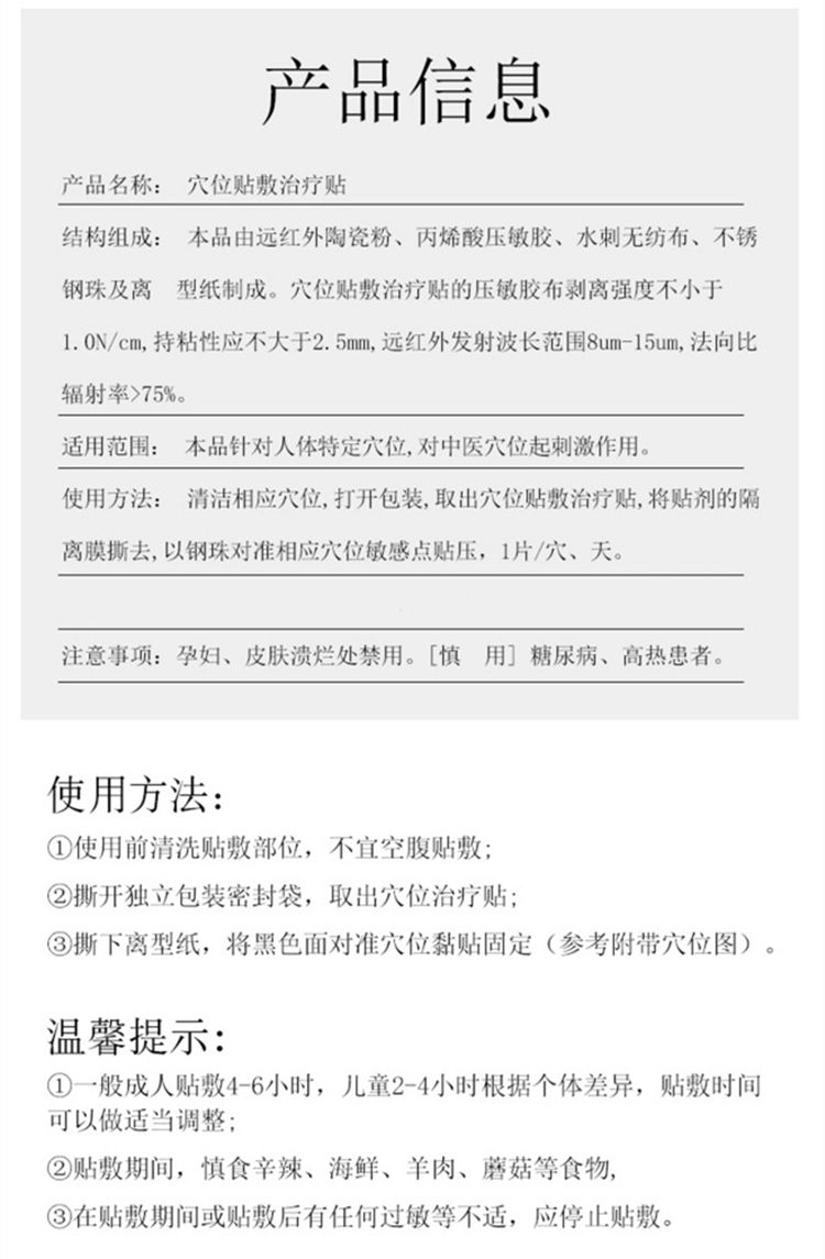使用方法 將貼劑的隔離膜撕去,以鋼珠對準相應穴位敏感點貼壓,1片/穴、天,每日適度按壓3~5次,每次3~5**,1個療程為10天,療程間隔2~3天。(成人每次貼敷時間為6~8小時,兒童貼敷為2~4小時)