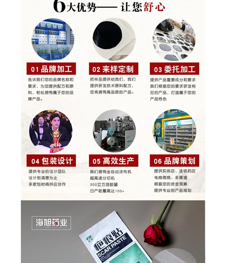 產品賣點 海旭疤痕貼多省高價中標、嚴格市場保護,操作簡單,市場需求量大,誠邀您的加盟,確保您的膏藥代加工產品安心上市!