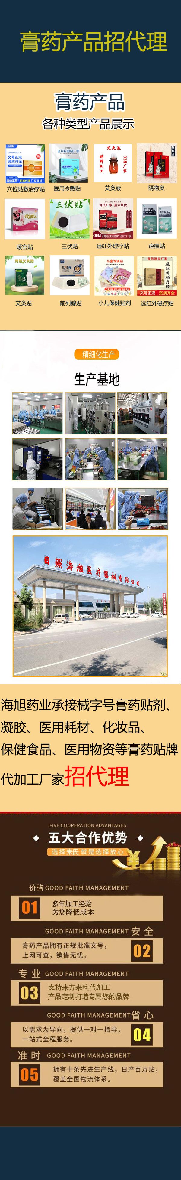 海旭醫(yī)療主要承接各類暖宮貼定制、遠紅外理療貼代加工、磁療貼貼牌加工、穴位敷貼廠家、灸熱貼代加工、退熱貼代加工、燙熨治療包定制、小兒咳 喘腹瀉膏藥定制加工、艾灸貼定制、化妝品定制、保健食品定制、噴劑、乳膏類加 工等醫(yī)院臨床和終端診所所需的系列產(chǎn)品。公司的經(jīng)營范圍有:骨科,婦科、男科、手術(shù)科、五官科和小兒科等。