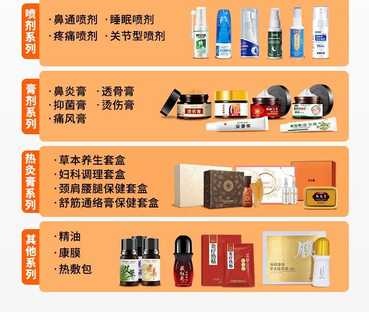 - 海旭醫(yī)療主要承接各類暖宮貼定制、遠紅外理療貼代加工、磁療貼貼牌加工、穴位敷貼廠家、灸熱貼代加工、退熱貼代加工、燙熨治療包定制、小兒咳 喘腹瀉膏藥定制加工、艾灸貼定制、化妝品定制、保健食品定制、噴劑、乳膏類加 工等醫(yī)院臨床和終端診所所需的系列產(chǎn)品。公司的經(jīng)營范圍有:骨科,婦科、男科、手術(shù)科、五官科和小兒科等。