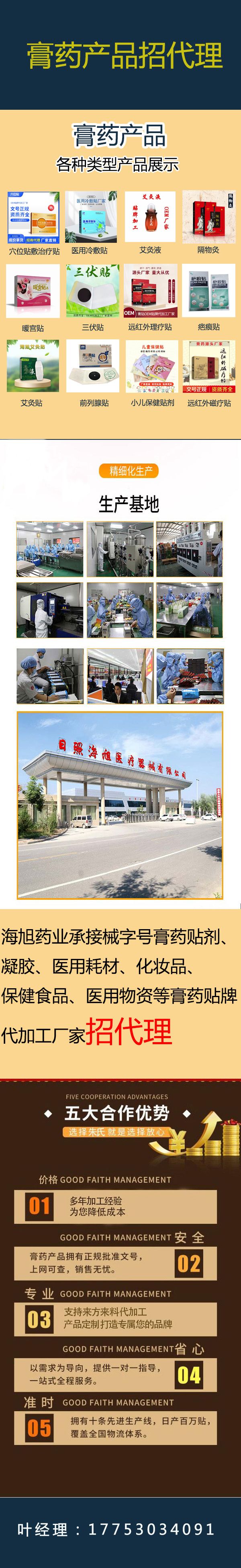 - 海旭醫(yī)療主要承接各類暖宮貼定制、遠紅外理療貼代加工、磁療貼貼牌加工、穴位敷貼廠家、灸熱貼代加工、退熱貼代加工、燙熨治療包定制、小兒咳 喘腹瀉膏藥定制加工、艾灸貼定制、化妝品定制、保健食品定制、噴劑、乳膏類加 工等醫(yī)院臨床和終端診所所需的系列產(chǎn)品。公司的經(jīng)營范圍有:骨科,婦科、男科、手術(shù)科、五官科和小兒科等。