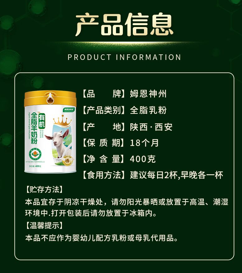 | 產(chǎn)品名稱 | 姆恩神州·有機全脂羊奶粉 |