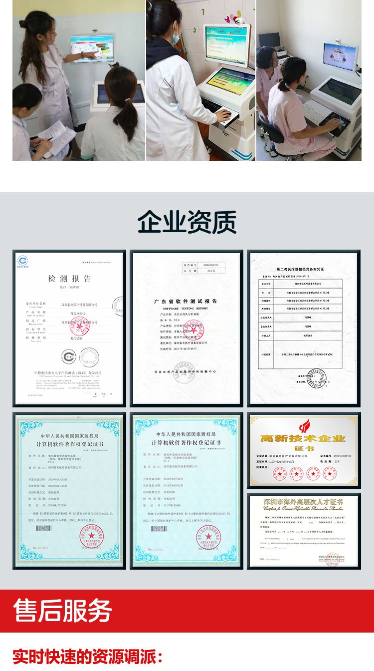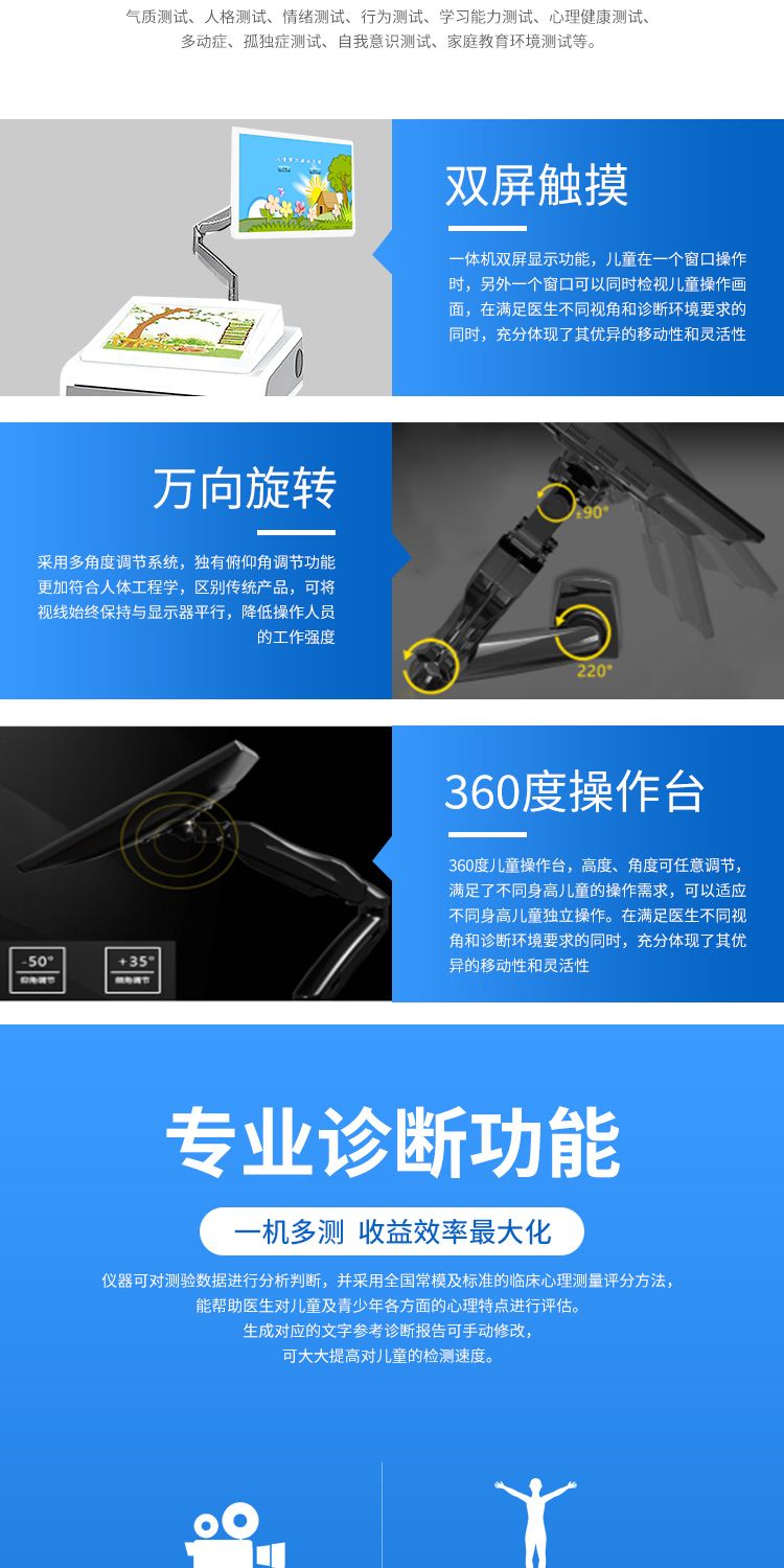 | 補充說明 | 系統(tǒng)具有21大模塊功能測評,共127個測試項目; 系統(tǒng)功能: 兒童智能發(fā)育篩查、兒童智力(IQ)測評、兒童注意力(CQ)測評與訓(xùn)練、兒童生長發(fā)育測評、感覺統(tǒng)合能力測評(SIT)、小兒動作神經(jīng)發(fā)育檢測系統(tǒng)、兒童多動癥測評、兒童孤獨癥測評、兒童心理健康測評、兒童行為測評、兒童焦慮測評、兒童抑郁癥測評、兒童氣質(zhì)測評 、兒童家庭成長環(huán)境測評、人格因素測評,兒童膳食營養(yǎng)與帶量食譜、兒科常用中成藥與兒科常用檢驗正常值等。 性能特點: 1、一體機雙屏顯示,雙19寸LED醫(yī)用觸摸顯示屏,測試畫面同步顯示; 2、具有360度兒童操作臺,高度、角度可任意調(diào)節(jié),可以適應(yīng)不同身高兒童獨立操作; 3、儀器采用阻尼推車一體化時尚外觀,嵌入式鼠標、鍵盤可推拉隱藏,四個萬向腳輪可輕松移動; 4、用戶可根據(jù)需求按“編號”、“姓名”、“出生日期”、“測試日期”等關(guān)鍵字對報告進行查詢、排序,數(shù)據(jù)統(tǒng)計快速、便捷; 5、系統(tǒng)自動生成診斷報告,可手動修改醫(yī)生建議,對不同患者進行專屬評價。標準A4紙報告打印。 |